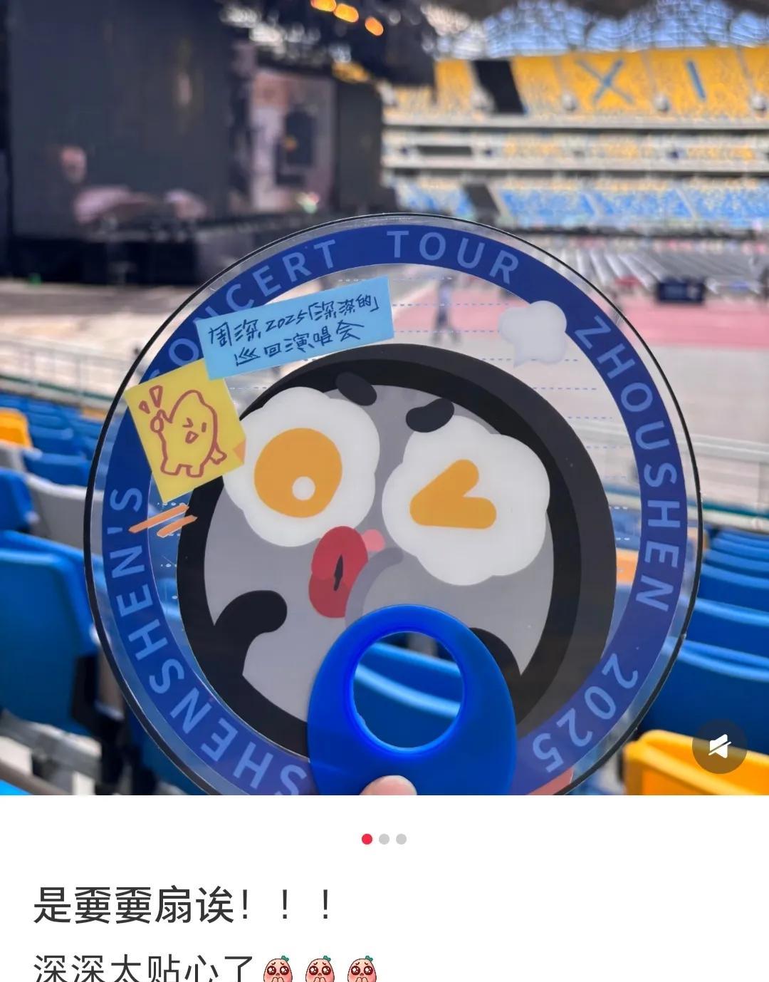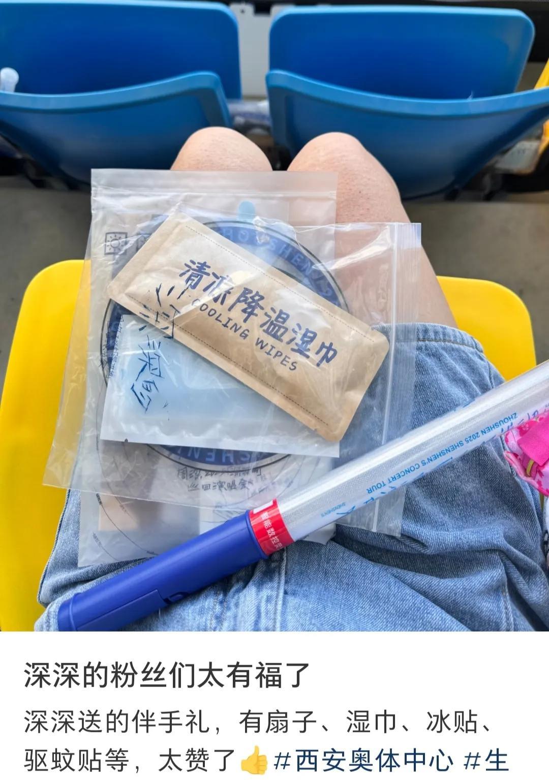 周深西安演唱会! 这次西安演唱会伴手礼又升级了,有嫑嫑的扇子,还有降温湿巾,冰帖! 还给志愿者买雪糕,而且现场牌子写着本场演出还有水泡特效! 周深的周是周到的周,太周到了!#周深#