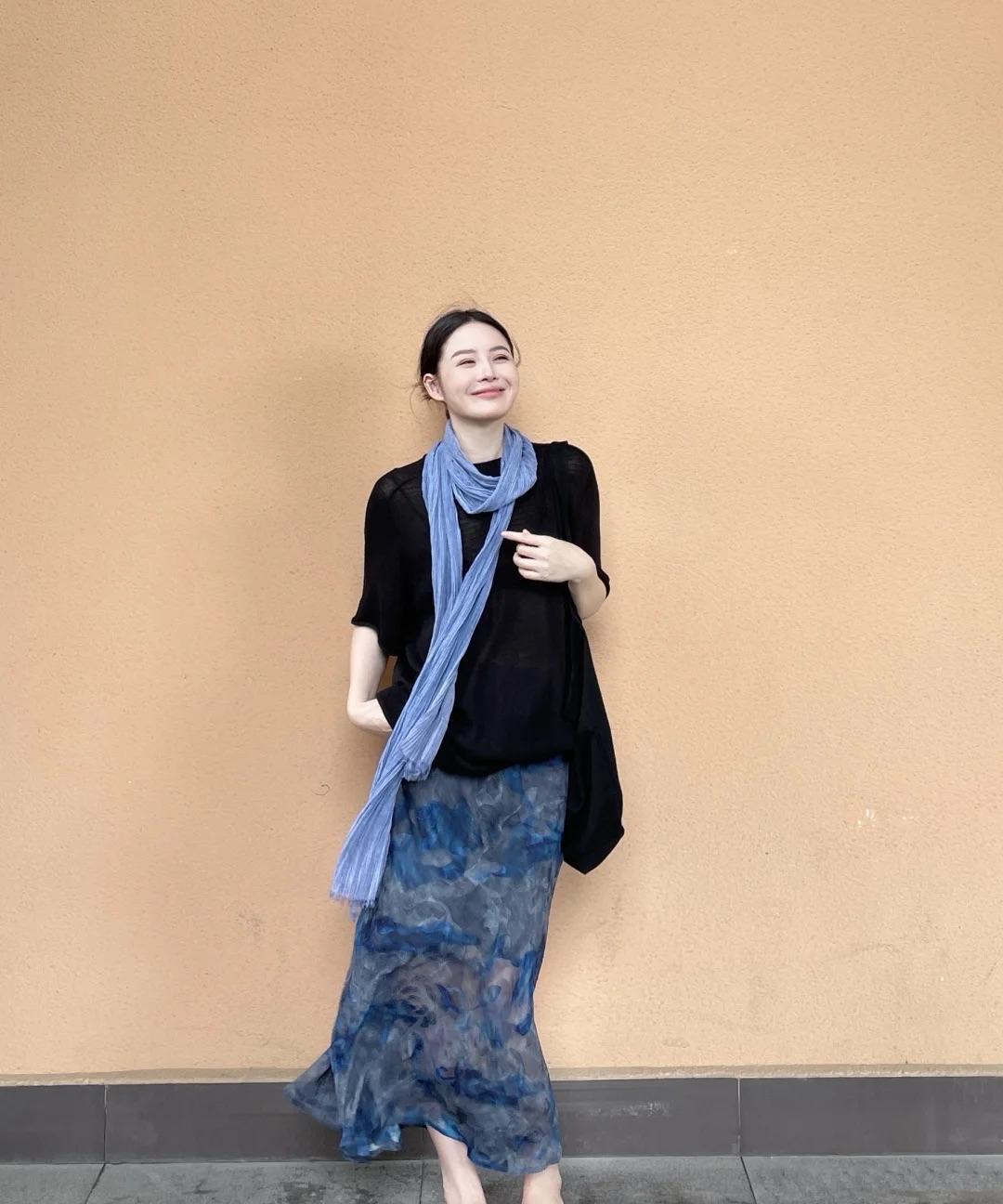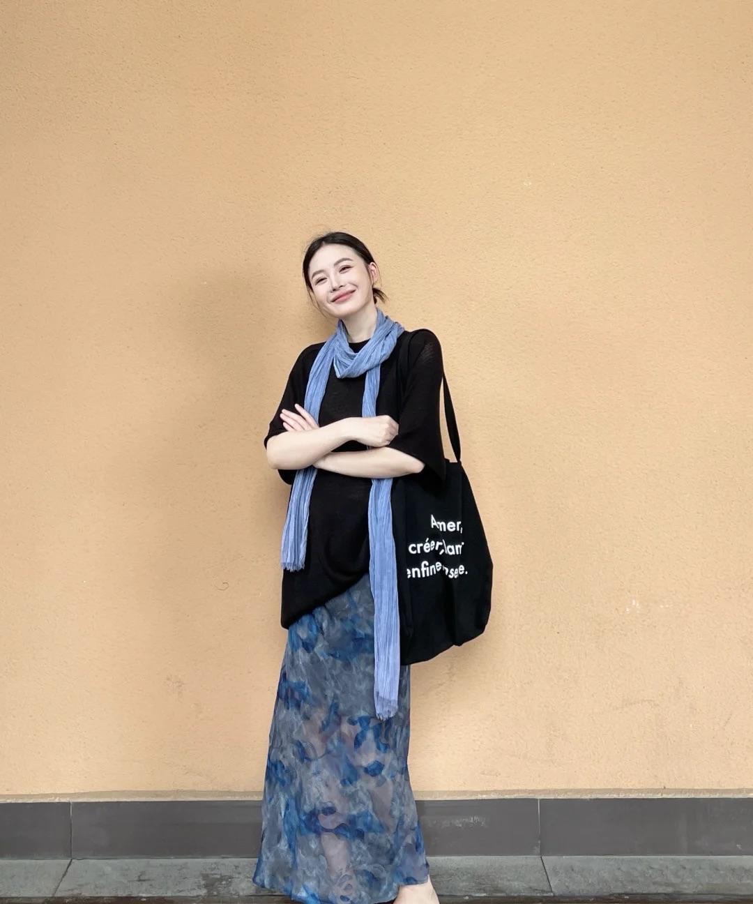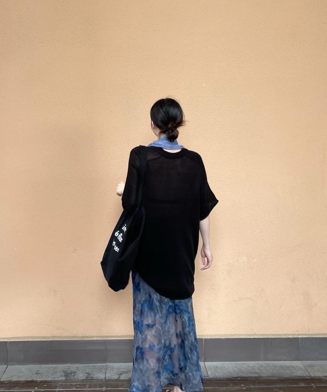 黑十蓝,意外好看呀! 宽松肥大的黑色T恤,微透设计增加了清凉感, 搭配一条蓝色碎花裙,蓝黑色组合低调温婉,很大气呀! 博主还搭配了一条蓝色长条围巾和裙子呼应,氛围感拉满,更有层次!