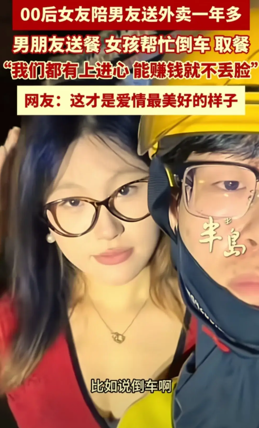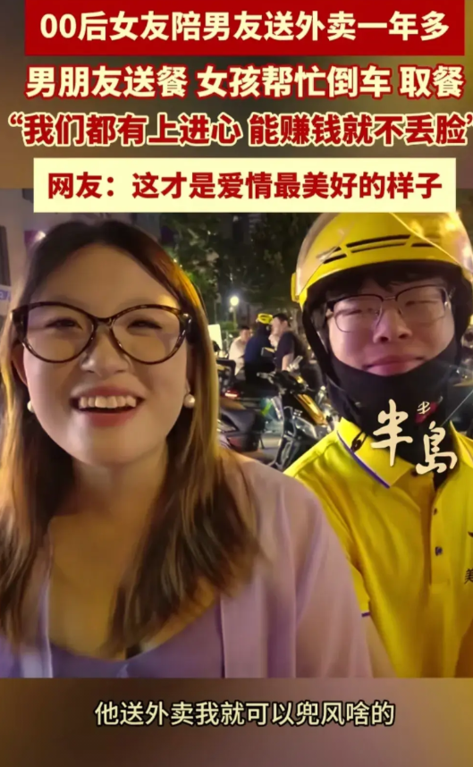 女孩说:她陪着男朋友一起送外卖,也可以兜兜风,他也干的舒心。男朋友送餐,她就帮忙倒车,取餐。都有上进心,只要赚钱就不会觉得丢脸。
