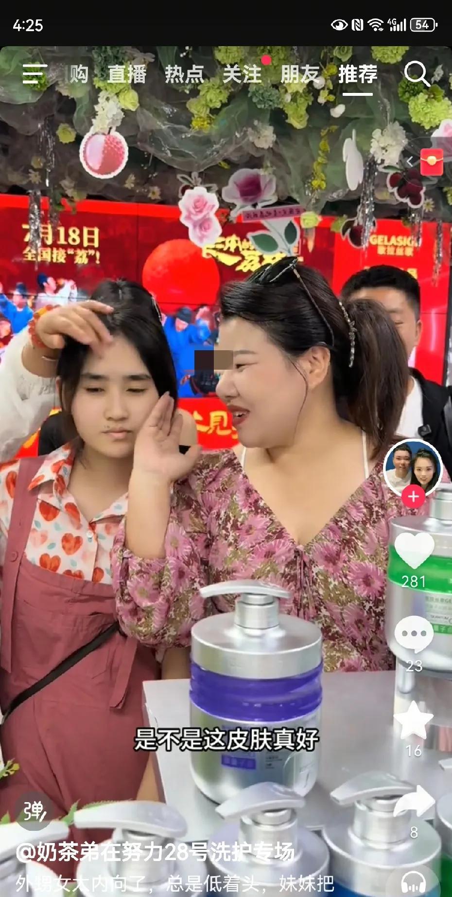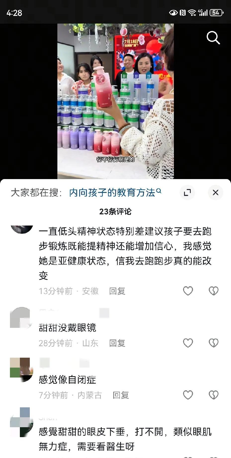 奶总家族在歌拉斯歌公司打广告。 二姐跟男扮女装的小哥哥互动,果然,男人骚起来真没女人啥事,太娘了,不忍直视,当然,她们想要的效果是达到了。 甜甜又一次被拉到台前,站到了C位,但是,她好不自然,好尴尬难受的样子。头不敢抬,让头发遮住眼睛遮住脸,后面奶总和菲菲都把她往镜头前拉,又附在她耳朵旁边叮嘱。无奈抬头了,那眼睛却一直一直眨,不知是近视还是眼皮肌无力,感觉像是困得不行,完全睁不开的那种。很多网友纷纷猜测她是不是不止是内向,倒像是有些不太正常,建议带去医院看看。