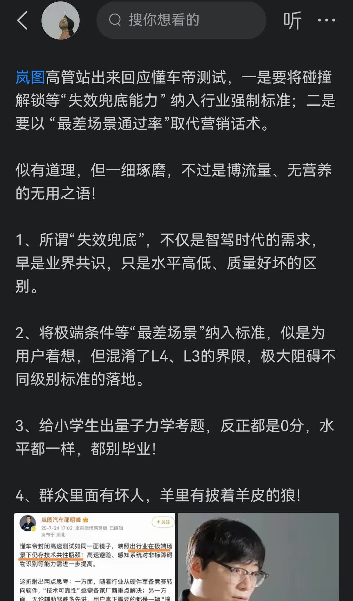 一场测试,懂车帝成了过街老鼠[捂脸] 懂车帝被央视删掉了“联合”、清掉了链接,与岚图的互动都急匆匆设置了权限。 但现在岚图高管估计如吃下一只蟑螂般难受。一个毫无营养、无关紧要的拍马贴,却被懂车帝贴上黏住,几乎成了共情甚至恭维、讨好懂车帝的罪证[大笑]。