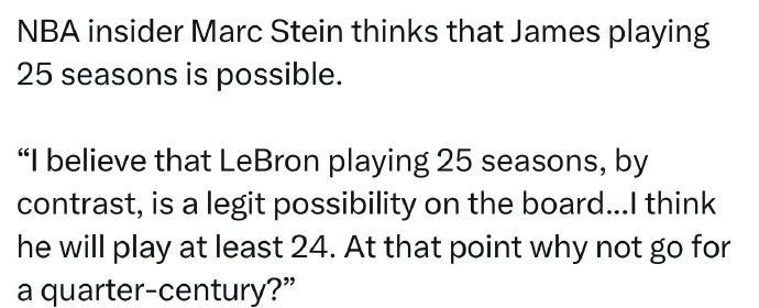 知名记者MarcStein:“我认为勒布朗打满25个赛季是一个真正的可能性。这