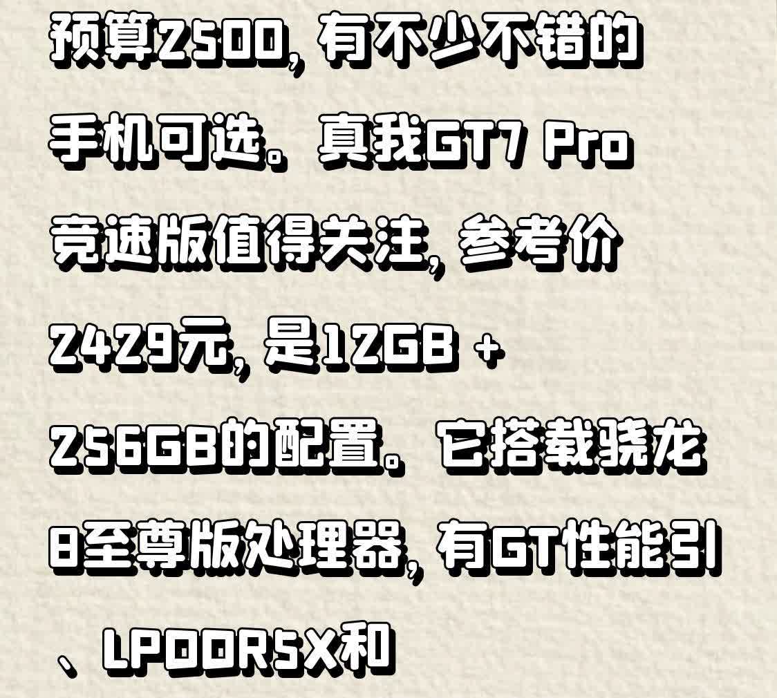预算2500,有不少不错的手机可选。 真我GT7 Pro竞速版值得关注,参考价2429元,是12GB + 256GB的配置。它搭载骁龙8至尊版处理器,有GT性能引、LPDDR5X和UFS4.1内存组合,性能强劲。内置6500mAh电池,支持120W有线快充,续航测试达9小时35分钟。屏幕是三星S2材质6.78英寸1.5K等深四曲屏,还有6000nit超高局部峰值亮度。 另外,像Redmi K60、iQOO Neo8 Pro、realme GT Neo5 SE也是性能与拍照均衡的中高端之选。注重品牌的话,华为nova 11、荣耀90 GT可以考虑;侧重拍照,vivo S17是个好选择。 Pro7