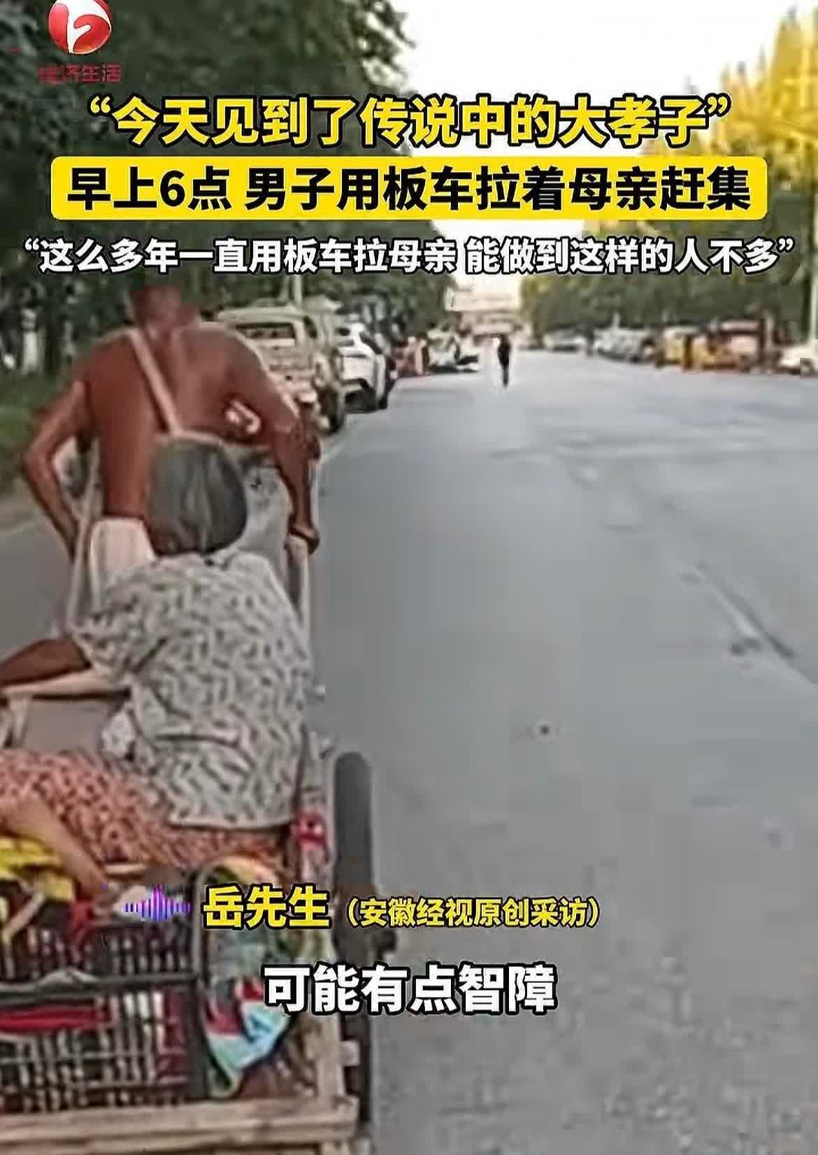 “傻儿疼娘,孝不在穷富!”,安徽阜阳清晨不到六点钟,男子用板车拉着母亲去赶集,这么多年一直用板车拉母亲,能做到这样的人真不多了,让人感慨又感动! 7月25日安徽阜阳,早上还不到六点的时候,一位网友岳先生看到街上有位男子正用板车拉着自己的母亲去赶集,看到这一幕的岳先生也是感慨的说:“今天总算是见到传说中的大孝子了,不到六点就拉着他妈来赶集了,那些当大老板的孩子又能怎么样,人这一辈子怎么活不是活,这位老人还是幸福的!” 据岳先生说,这名拉着板车的男子,智力可能有些缺陷,因为早晨比较凉快一些,于是就用板车拉着他的母亲来赶集了,不到六点钟就到了街上,这么多年来他一直用板车拉母亲,一如既往的照顾母亲几十年,能做这样的人真不多了! 老话说的一点也不假,有本事的孩子都远早高飞了,真正能孝顺的偏偏就是留在父母身边的平凡子女,往往最孝顺的那个孩子也是最没本事的,傻儿疼娘,孝子人人敬,能几十年如一日的用平板拉母亲,能有这样的孝心,对于很多正常人来说都做不到,他比正常人强多了! 孝不在穷富,富人有富人的孝顺方式,穷人也有穷人的孝顺方式,只要是有孝心的人,都值得别人的尊重! 其实幸福,不属于富人,也不属于穷人,属于那些懂得知足的人! 聊热点