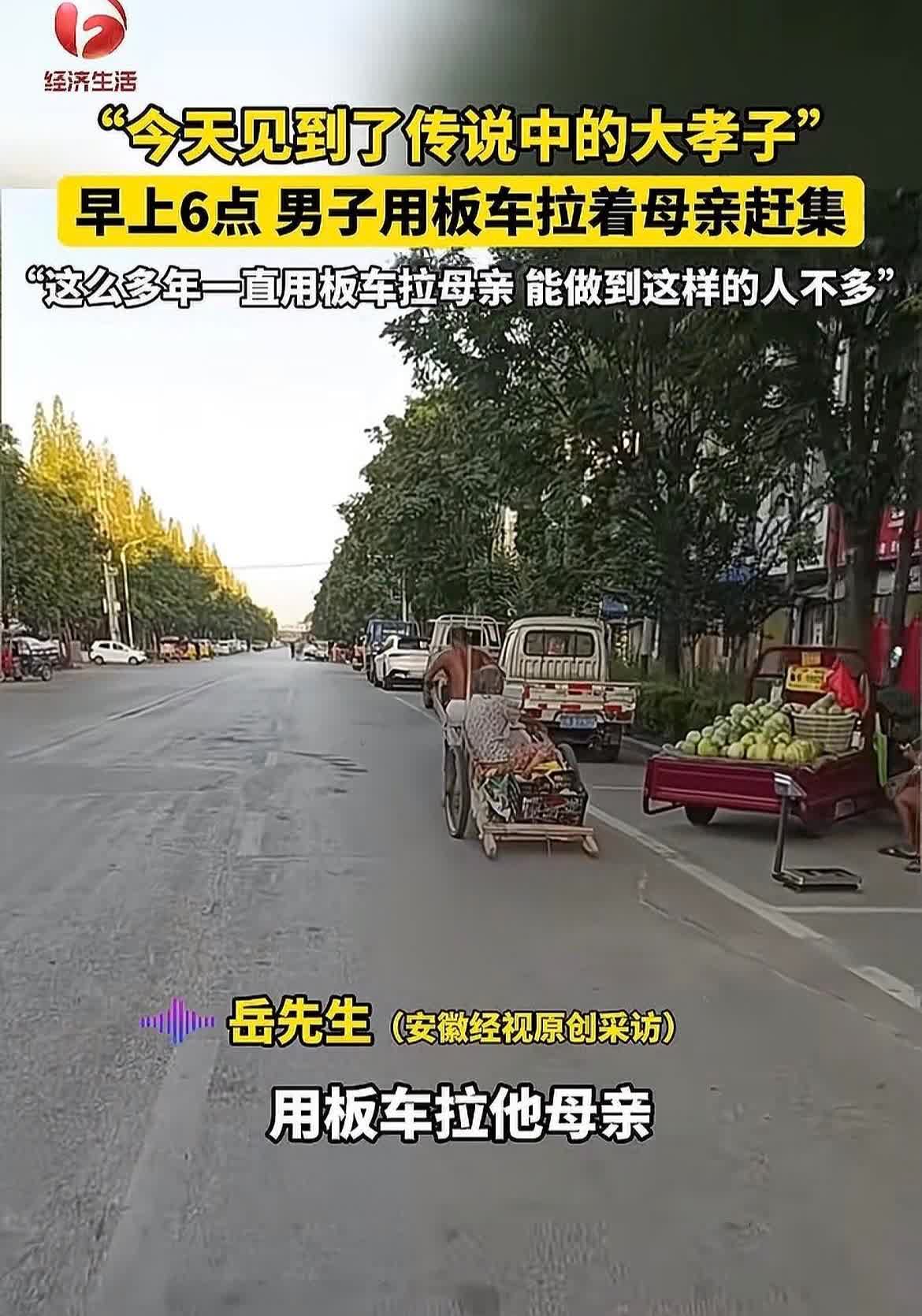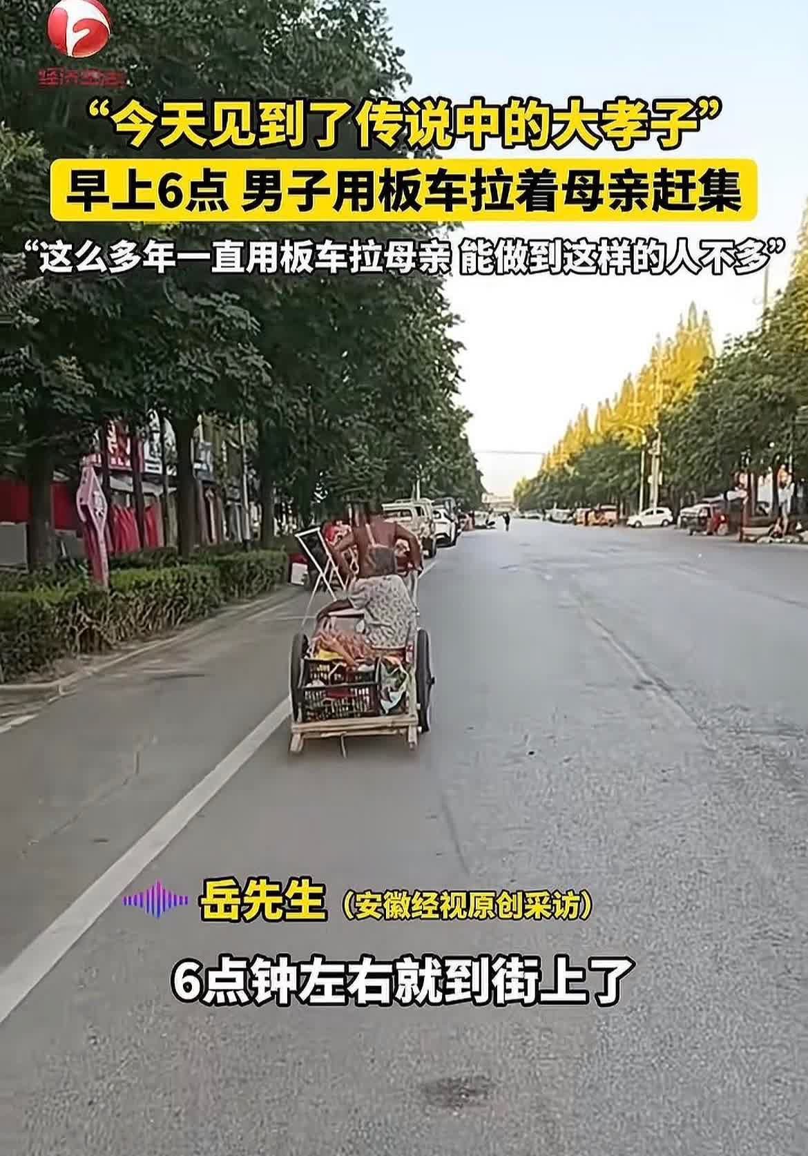 “傻儿疼娘,孝不在穷富!”,安徽阜阳清晨不到六点钟,男子用板车拉着母亲去赶集,这