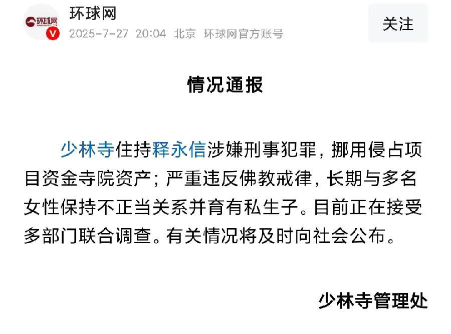 释永信被查, 彻底坐不住了, 给我姑妈打了个电话, 告诉她: 不要相信和尚能够超
