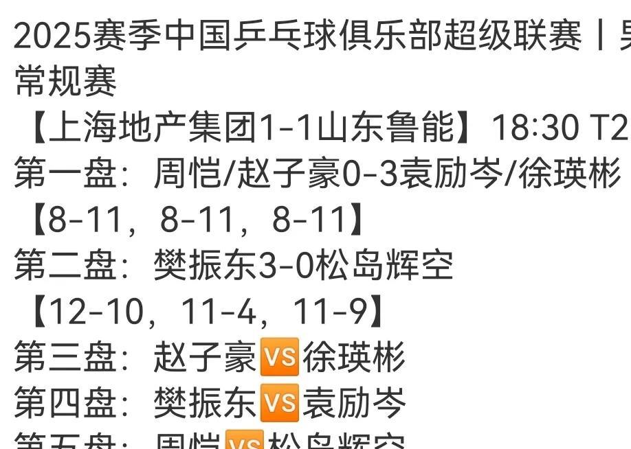 樊振东3-0松岛辉空 少爷输得很彻底,除了首局打得有来有回,局末小胖12-10拿下,第二局少爷完全被小胖拿捏,11-4迅速取胜。第三局小胖5-1领先了,松岛顽强追分6-5小胖只领先了1分,10-8小胖盘点,11-9小胖为上海地产拿到第1分。。 上海地产1-1山东鲁能