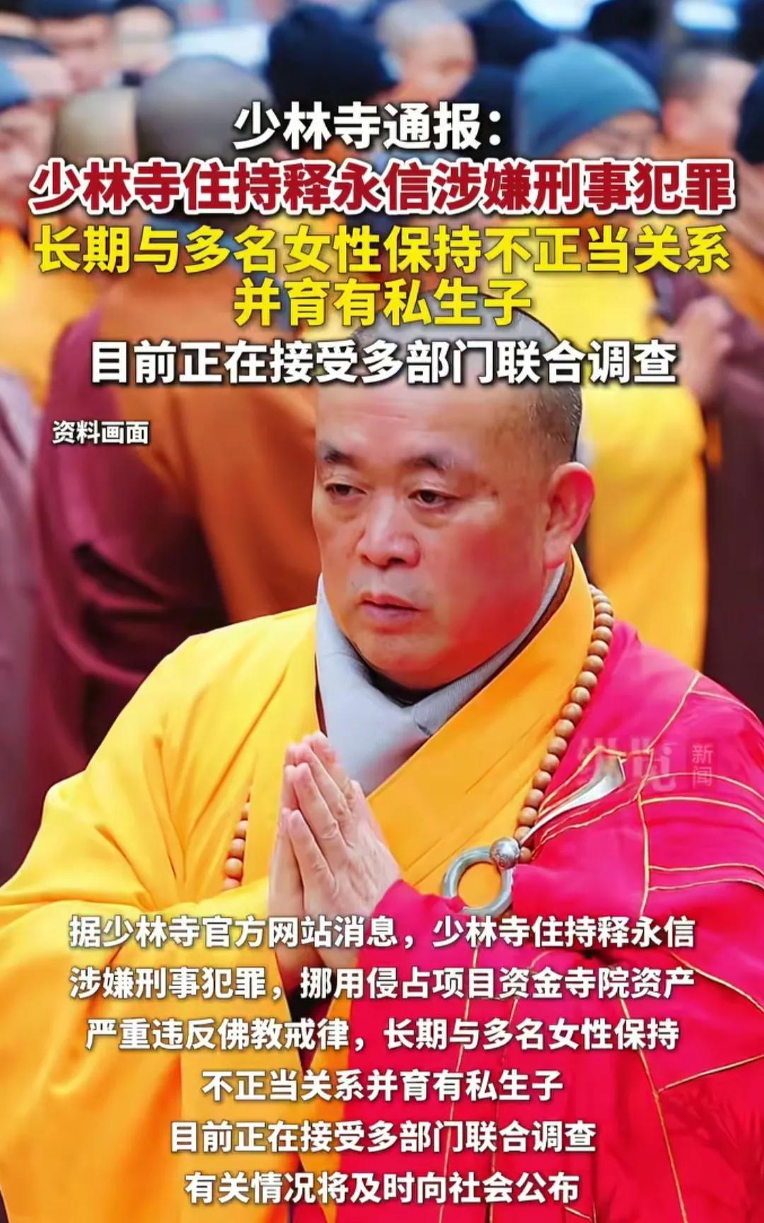 少林寺住持释永信十年前就被调查 十年后再次被确定确实有问题 真是在佛祖眼皮下,作奸犯科 也不知道天天念的什么经 佛门本来就是修心养性之地 教导人弃恶从善,归一佛门 现在怎么变的和尚不和尚 真真假假,假假真真都分不清了!