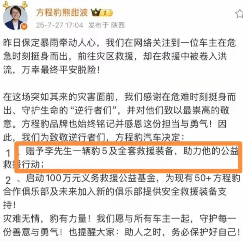 不好了,趁魏建军不在家,他的老家保定被“袭击”了,河北保定阜平县遭遇特大暴雨袭击。多辆汽车被困,关键时刻比亚迪出马,作为方程豹豹5车主的李先生,二话不说上车就去提供救援,把安全抛在脑后,可是人间有情,暴雨无情,把李先生的硬派越野车给冲报废了,熊甜波得知此事,马上安排新的豹5免费赠送给李先生,为致敬其见义勇为的行为,还有全套救援装备。 这也是熊甜波第一次赠送方程豹给车主,真的是好的开始。长城汽车放高温假十天,长城硬派越野车关键时刻哪去了,坦克300呢?猛龙呢?保定可是长城汽车的老根据地,和方程豹一起上呀!有你们保定一定平安无事。保定加油,长城比亚迪加油。