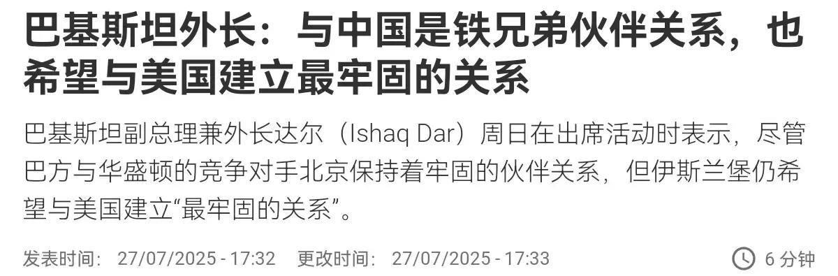 巴基斯坦外长达尔7月27日公开表示,巴基斯坦与中国是铁一般的伙伴关系,但是巴基斯