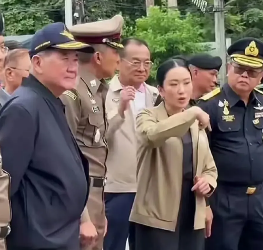 佩通坦视察边境,泰国代总理普坦陪同,普坦侧身,佩通坦妥妥的C位大女主,军方和普坦一起听取佩通坦的指示。