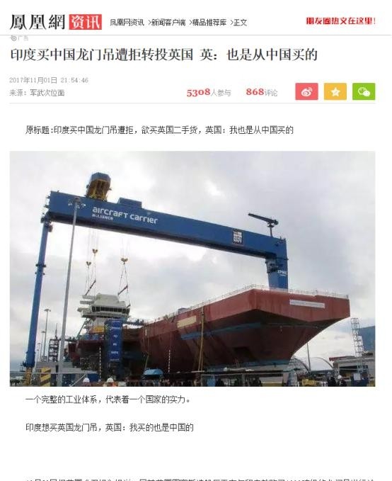 2017年,印度为了造航母,决定购买大型龙门吊。全世界问了一圈,只有中国产。可印度太好面子,不愿买中国的,急得上火。后来,花了1.2亿美元从英国买了台二手龙门吊。可是拉回来一看,铭牌上竟然写着:Made in China!