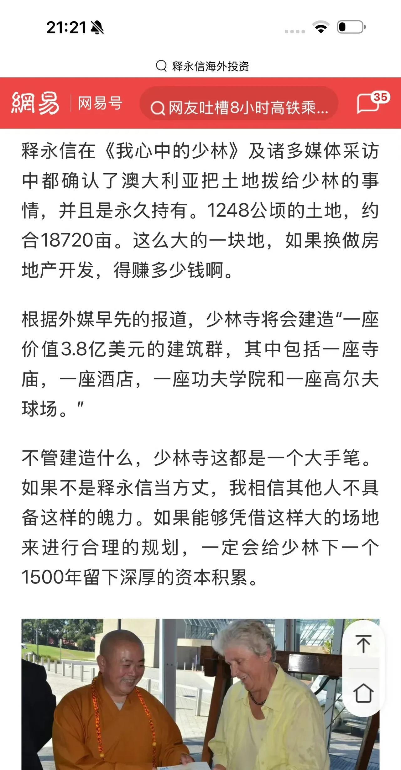 少林寺的海外资产可能相当惊人,世界各地不少国家都有少林寺分寺,19年的时候外媒报道称少林寺在澳大利亚购得1.8万亩永久土地,并计划花费3.8亿元建造一座“寺庙综合体”,包含一座寺庙,一座功夫学园,一座酒店以及一处高尔夫球场。因此可见少林寺在释永信的打造下,已经不是一个简单的宗教场所,而是一个商业帝国,其仰仗的是少林寺这个金字招牌,少林寺到底是国家的还是释永信的,这么大的商业帝国所获得的利益最后流入了谁的口袋,这些恐怕在才是这场风波背后的核心所在。