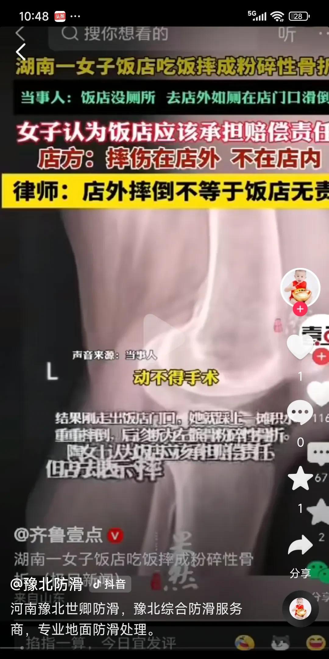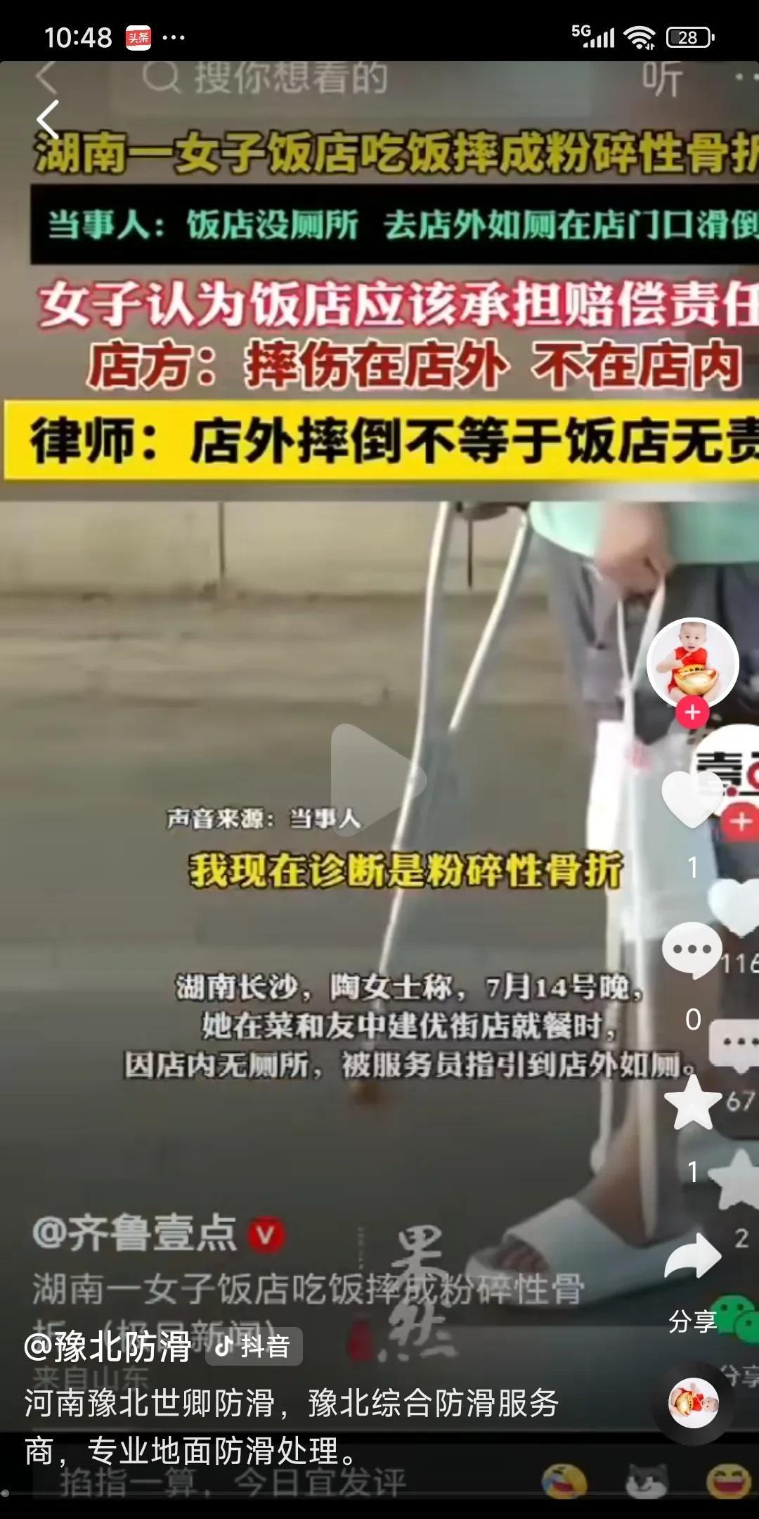 实在说不清了!女子因饭店里无厕所,去店外如厕被滑倒!受伤后,怪罪服务员,好心指引!律师却说,店家有责任! 这事真的就说不清了?这么大个人,自己去饭店吃饭,中途去厕所,服务员好心指引,店里没有厕所,需要到隔壁, 女子途中,不小心踩到积水,自己滑倒了, 被送到医院,是粉,碎,性骨折, 于是,女子把店家告了? 律师还说,店家要负一定的责任! 如果不去吃饭,她摔倒了,要找谁? 是不是要找修路的? 太奇葩了!