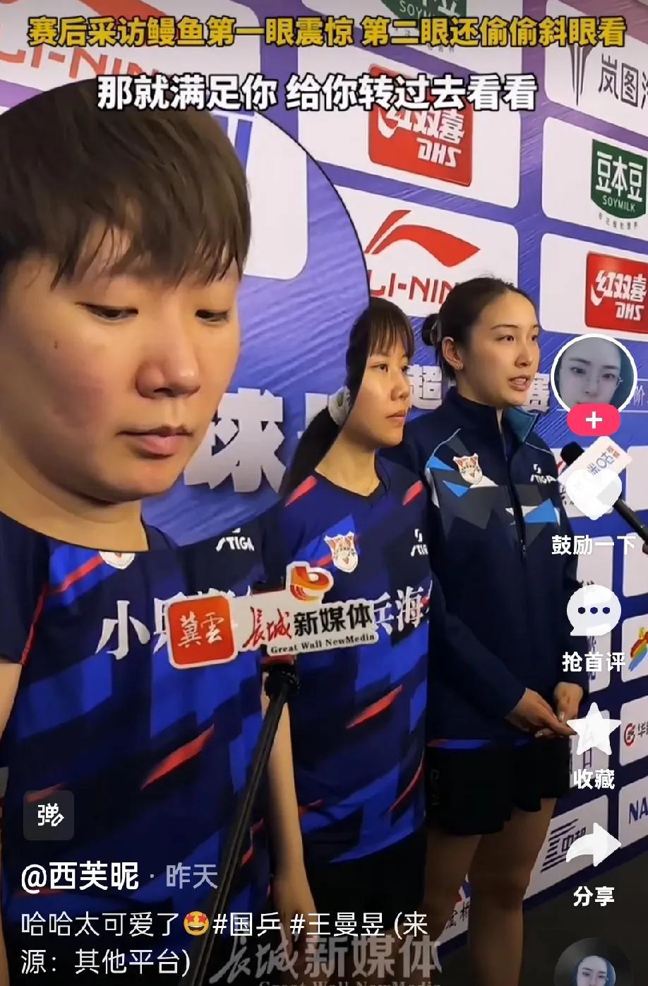 “好身体,好心情,好未来,王曼昱健康涨球”粉丝们太棒了,短短的几秒视频几句话,暖到了心坎上,曼昱太可爱了,无论何时何地,都招人喜爱,这几天的乒超联赛,担负起了绝对的主力和责任,每一天都能看到她精彩绝伦的比赛,采访中更是可爱到极点,当不知道是那个媒体采访时,曼昱偷偷斜眼看,这表情太搞笑了,记者发现后,索性把牌子转过去,让曼昱看的清清楚楚,明明白白,当记者问明天最后一天你们的比赛阵容会有所调整和轮换吗?曼昱开玩笑的说,比赛还没打,就想套我们的阵容?哈哈哈,回复的太秒了,太幽默,太可爱了[心][心][心]
