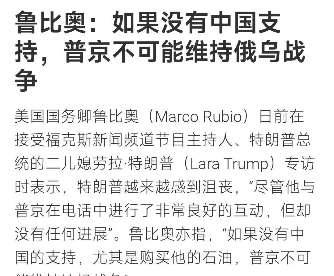 卢比奥说,如果中国不购买俄罗斯的石油,俄罗斯早就撑不下去了,俄乌战争早就无法持续