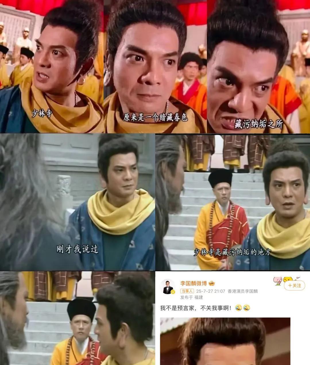 谁能想到,释永信被查,最慌的居然是鸠摩智扮演者李国麟老师。起因竟是他在电视剧《天龙八部》里的一句台词,“少林寺,原来是一个暗藏春色,藏污纳垢之所”,这句话与当前事件高度重合,引起广大网友玩梗潮。 也有网友说,不是李国麟老师厉害能预言,而是金庸老先生更有先见之明,早早就看透了人性的本质。 这个看法倒也不是没有道理,也难怪,大家如今都要拿着以前的台词说事,网友现在都说他是大预言家,吓得李国麟老师赶紧出来自证。 虽然,他第一时间就和这件事理清了关系,只是网友很明显不愿意放过他,还是到处传这张图。 其实,到现在大家还是不敢相信这件事,刚开始,就有很多人觉得这件事不可信,现在真是求锤得锤,实锤越来越多了。 (每天更新,点进主页我们一起看世界!喜欢文章的可以帮忙点个关注点个赞~) 再看看曾经这些台词,才知道,什么叫经典咏流传,大家怎么看?