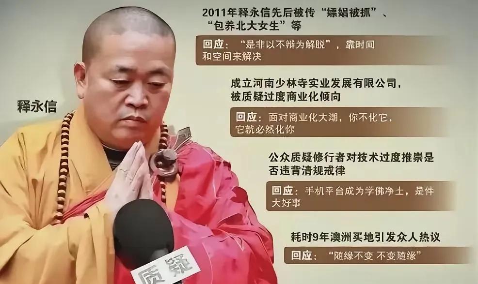 释永信由大和尚到“花和尚”的蜕变。一个身份是吃斋念佛,打坐念经千年古寺的方丈,另一个身份是身价过亿,有多名情妇并有私生子的“CEO”,这就是释永信的双面人生。任谁也不会把他们结合到一起。然而现实却是释永信表面是主持少林寺的大和尚,其实内心早已利欲熏心彻底黑化,是一个妥妥的“花和尚”。这样的人太可恨,就是典型的两面人,就是佛祖见了也不会原谅他了。大家觉得呢?