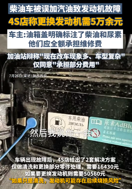 陕西西安,一女子开着长城炮柴油车,到某加油站加油,她告诉加油员: 柴油加满,加油员拿起油枪,一口气给她加了56.88升,女子又买了桶尿素,一共花了463.9元,可第二天发现,车子打不着火,故障灯亮了,4S店一测,是因加错汽油导致,女子这才知道,加油员给她加的是汽油,4s店说,如果只清洗换配件,要16430元,但后续会有烧损风 险,如果换发动机,费用50560元,女子找加油站索赔,加油站表示,他们只愿意承担一部分费用,加油站给出的理由,令女子惊呆! 据封面新闻7月26日报道,陕西西安的曹女士真是遇上了烦心事。 曹女士开着自己的“长城炮”柴油车,去延长壳牌加油站加油。 刚把车停稳,曹女士就对加油员说得明明白白:“柴油加满!一会再给我加瓶尿素。” 还特别强调了一下,毕竟她的车只能加柴油,车屁股那块写得清清楚楚,生怕弄错了。 结果加油员动作挺利索,拿起油枪就加油,整个过程看起来也没什么问题。 加完油后,曹女士一起结账刷了463块9,然后就开车回家了。 当时车子看着没啥异常,她也没多想。 可第二天早上,曹女士准备出门时就发现车有点不对劲——打火有点费劲。她心想可能是天气热影响了,没太当回事。 可等到第三天,车子直接打不着了,仪表盘上的故障灯也亮了,顿时觉得不妙,赶紧送去4S店检查。 一查才知道,原来是加错了油! 4S店告诉她,是汽油进了柴油车,这一下子曹女士傻了眼,立马意识到肯定是那天加油的时候出问题了。 4S店给了两个修车方案:便宜点的方案是清洗油路、更换几个零件,修下来要一万六多点,但以后发动机可能存在后续烧损风险。 稳妥点的就是直接换发动机,但费用就得五万多。 这可不是小钱,曹女士心疼得不行,想着一辆好好的车,结果被一枪油给毁了。 曹女士觉得自己已经交代得够清楚了,是加油站员工没听明白,责任肯定不在自己。 可曹女士去找加油站理论时,对方的态度让她一肚子气。 加油站承认是出了问题,但反过来又说她自己也得负责——理由是员工当时确认了两次“95号汽油”,她没否认,还领了汽油优惠券。而且还辩解称:现在改车的现象多,车型也复杂,只愿意承担部分费用。 这说法曹女士哪能接受?她反驳说:“我一直在你们这儿加柴油,从没加过汽油,也没领过什么汽油券。再说了,加柴油的车还买尿素,不是常识吗?你们员工就不能识别一下车辆?” 就这样,两边各执一词,协商了好几次也没谈拢。 曹女士实在没办法,只能报警处理。 但即便警方介入调解,还是没谈出个结果来。 事情被媒体曝光后,网友们也炸锅了,很多人都站在曹女士这边,觉得加油站实在太不负责任。 加油员的失误,怎么能让车主买单?再说了,作为专业加油站,员工难道连柴油和汽油车都分不清吗?这种低级错误也能犯,实在说不过去。 对此你怎么看?