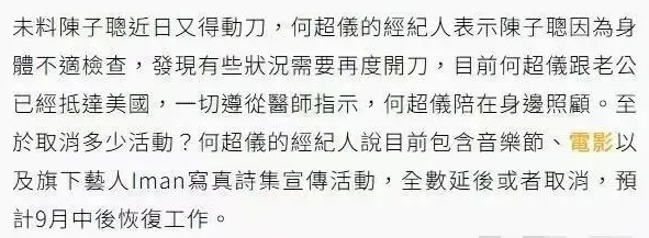 赌王女婿陈子聪再次病重,妻子何超仪宣布停工陪伴。