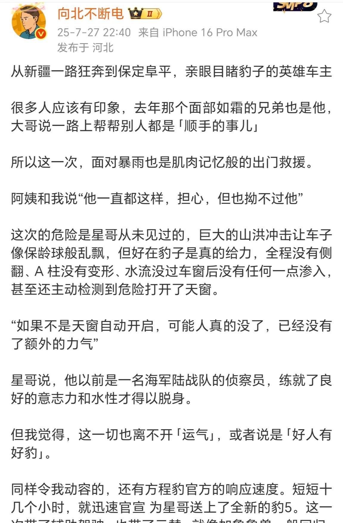 保定方程豹脱险很多人把功劳都归功于方程豹,其实车主才是能够脱险的主要因素,作为前海军陆战队侦查员,车主本人练就了一身的硬功夫。 面对危险临危不惧,加上过硬的心理素质以及良好的水性,才能够在方程豹打开车窗后安全脱身,换作是普通人哪怕方程豹把安全带都主动解开都不一定能脱身。 当然,方程豹的安全性不必多说,这一次比亚迪在长城的大本营露脸表现了一番,确实很亮眼,是台好车。 向北不断电不愧是比亚迪头号红粉,从新疆狂奔到保定现场,是真够拼的。 车主也是好人有好豹,官方再送一辆高配新车,人民子弟兵好样的!海军陆战队不是吹的,只要群众有需要,哪怕有危险,退役军人也一往无前!