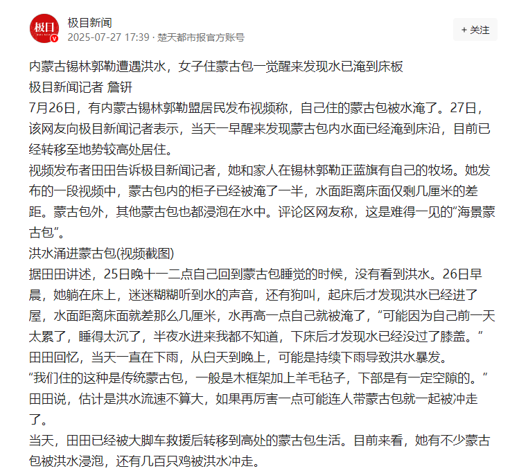 现在牧民定居越来越多,蒙古包改装层层加固,但周边的防洪基建还没跟上,挖个排水沟、修个堤坝、装个自动水位感应器,都比年年出事后临时救灾要靠谱。