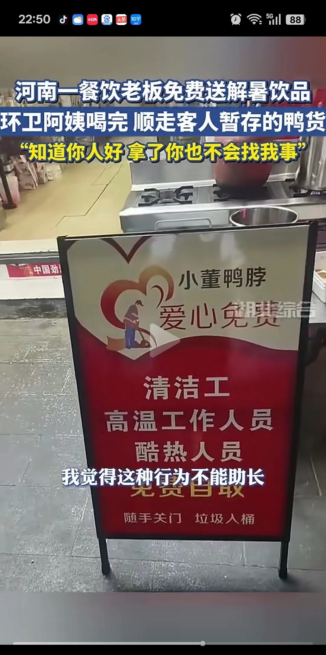 太寒心了!河南一老板看环卫工人辛苦,特意煮了一锅免费的绿豆汤给环卫工喝,不料女环卫工大妈打了一碗绿豆汤后,接下来的做法简直绝了,一起顺走了老板给客人打包的卤菜。 还一边走一边说:老板我知道你是好人,不会怪我的。老板一直重复,那就客人打包的,待会来拿,你放在那里 大妈当没听见一样,直接离开。老板气不过,直接追上去,给拿回来了。他说:不是舍不得这点东西,只是觉得不能惯她们。还表示以后会继续熬绿豆汤,不会停下 有些大妈就是喜欢占便宜,你跟她讲道理又不听,还说你小气,相信大家都深有体会