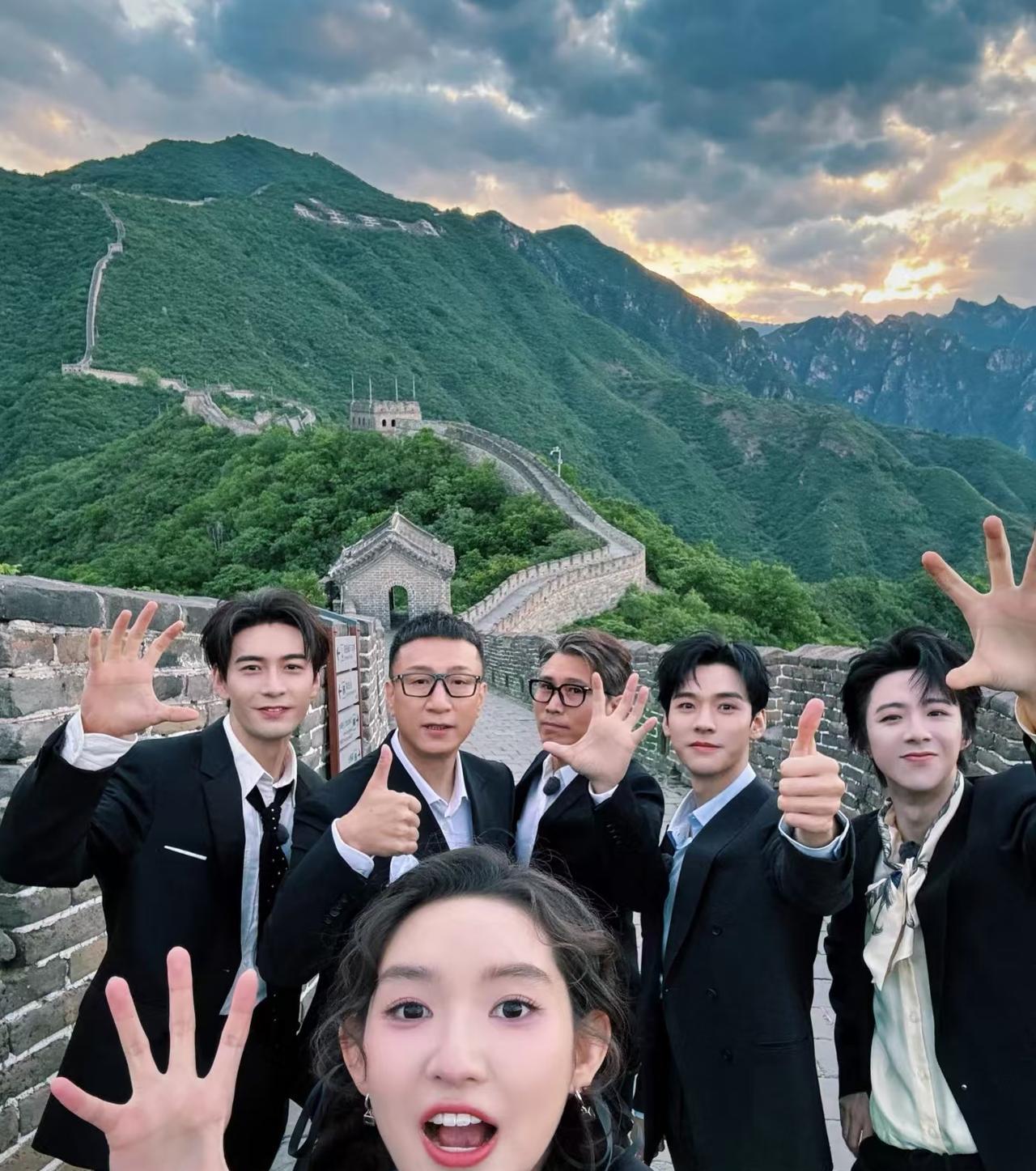 王玉雯分享了两张照片(图1和图2),被刘宇宁等五位帅气的男明星包围的她显得特别有