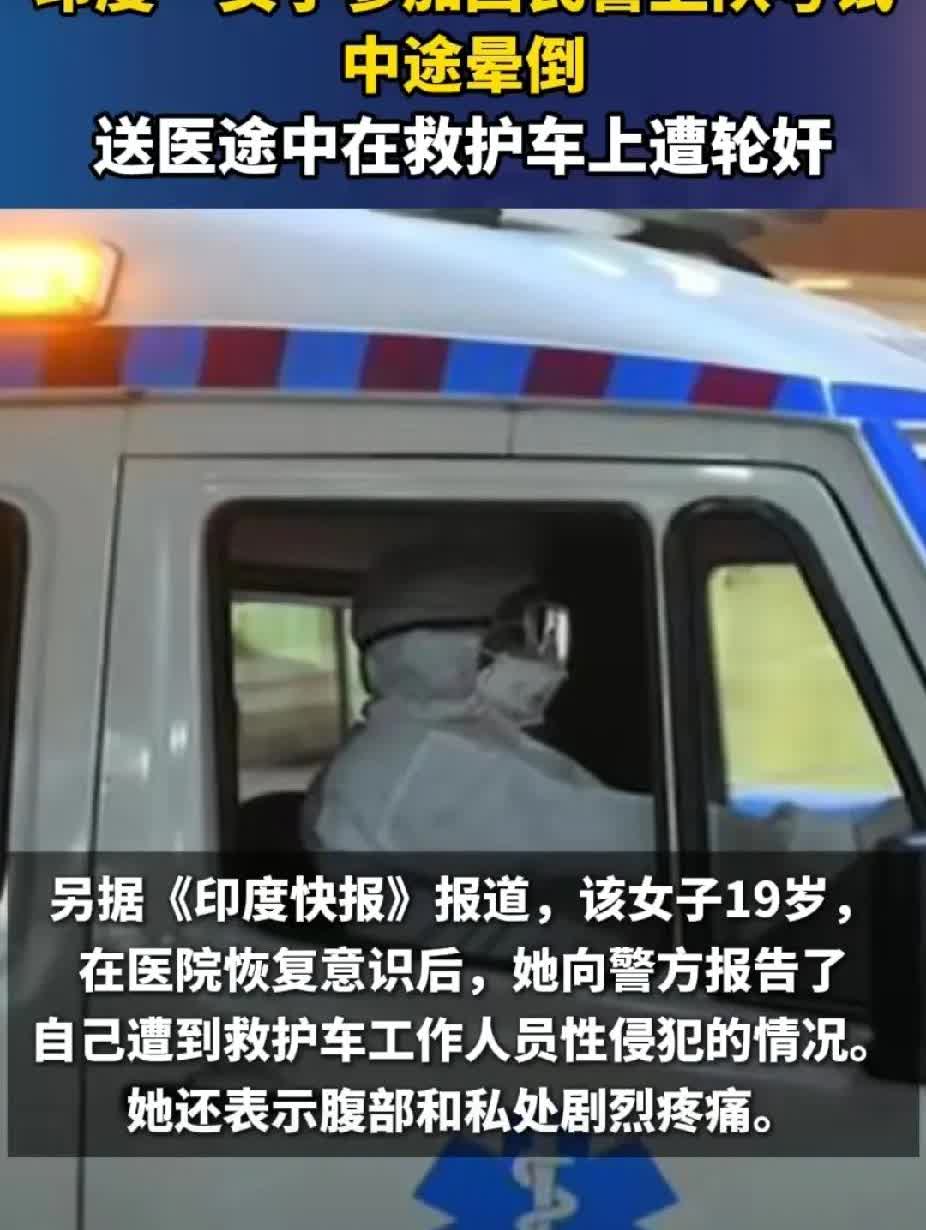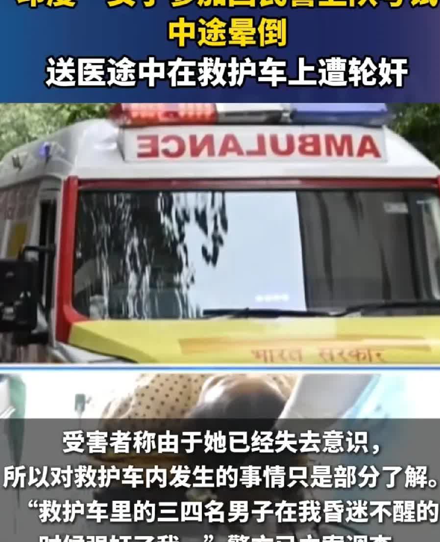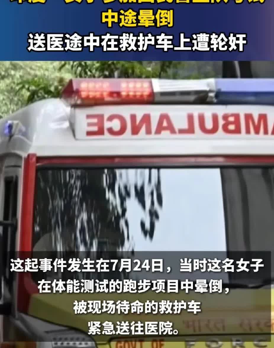 这印度女子也是到了血霉了。 一名19岁印度女子在参加国民警卫队体力考核时,由于体力不支晕倒了。 在送往医院的途中,救护车上4名医护男子见色起意轮奸了昏迷状态的印度女子。 最后这名女子到医院救治时,发现下体腹胀疼痛,才明白过来被人强奸了。