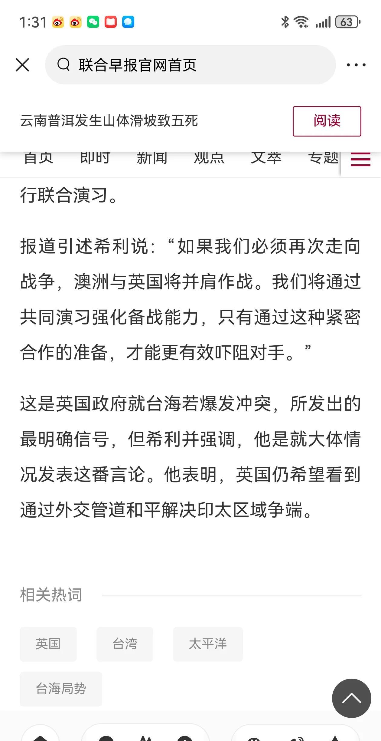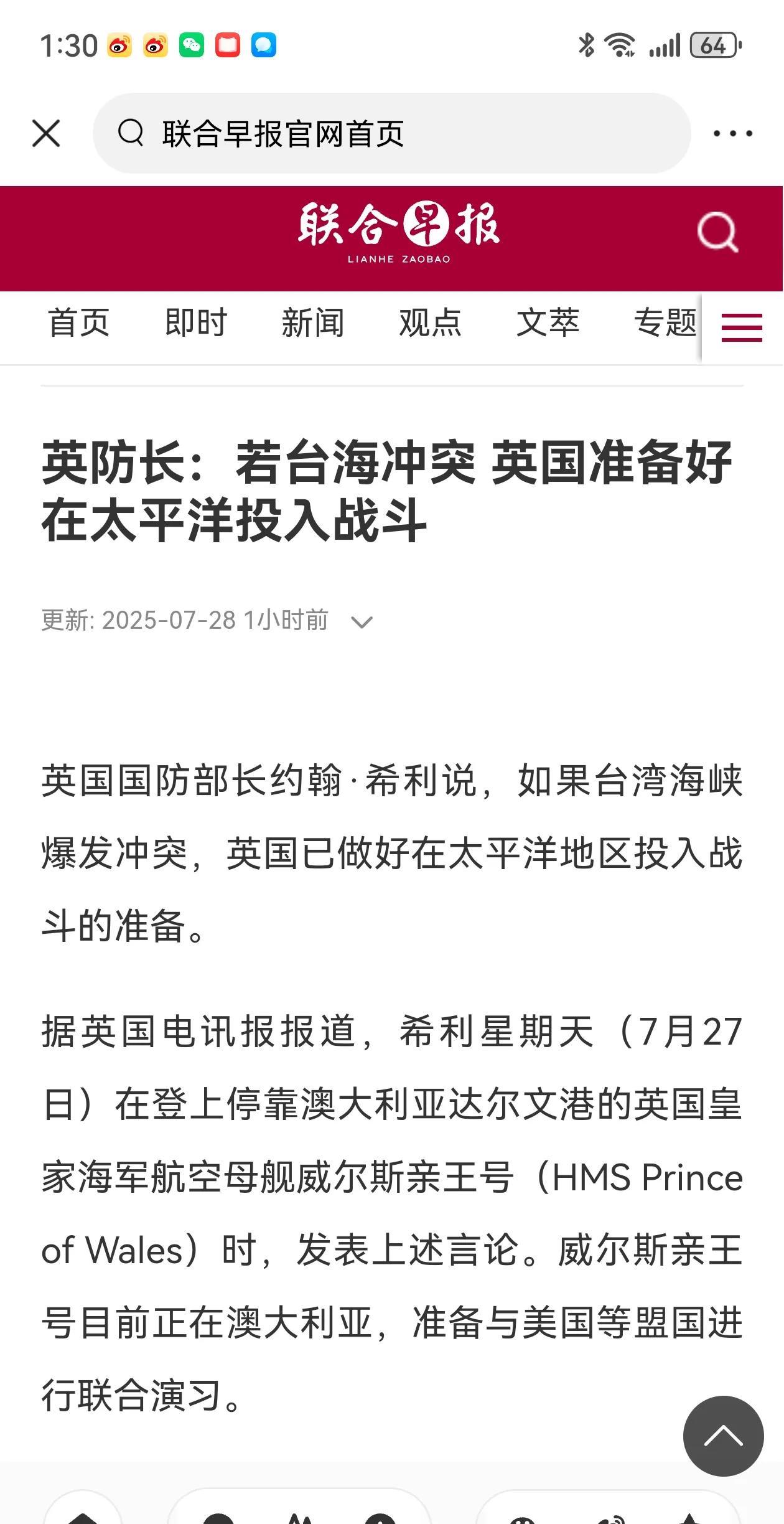 英国《每日电讯报》昨天(7月27日)报道:“英国国防大臣约翰.希利登上正在澳大利亚参加联合演习的英海军威尔士亲王号航空母舰时表示(图2),如果台湾海峡爆发冲突,英国已做好在太平洋地区投入战斗的准备。” 希利口出狂言,不自量力。台湾是中国的台湾,如何解决台湾问题是中国的内政,外部势力无权干涉,轮不着日已落帝国说三道四。中国积弱积贫的年代已经一去不复返,英国也不是当年的日不落帝国,就凭那几艘战舰到台海挑事闹事,我们定会让它有来无回。