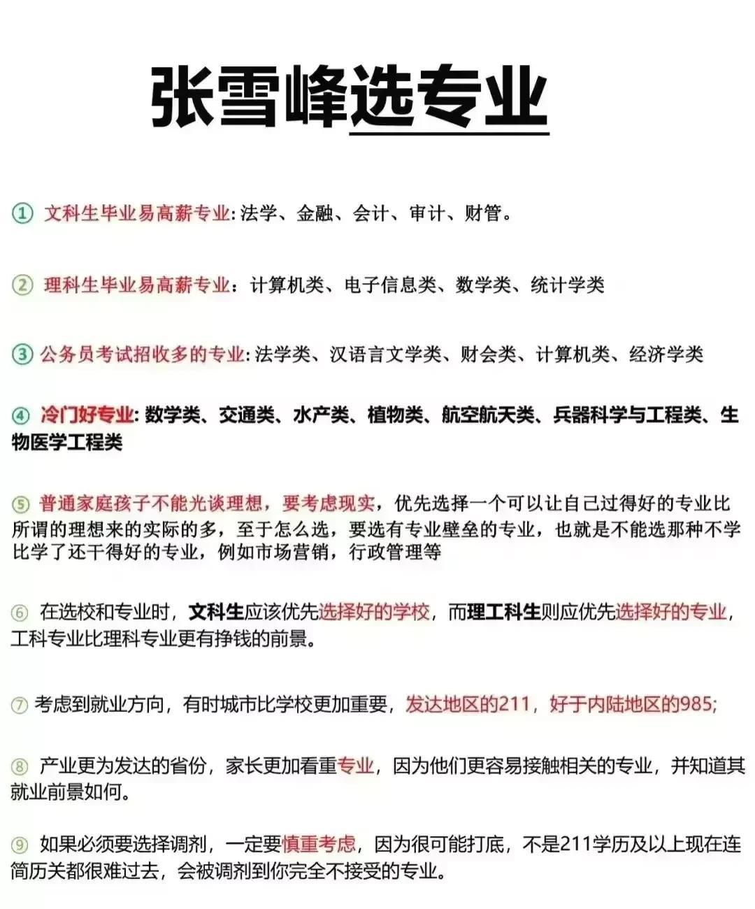 高一选科太重要了!高一选好科选好专业,高三报考不为难,毕业就是金饭碗!有时候考得好不如选得好,选择比努力更重要,原来上大学就是选专业,选对了就相当于捧上了金饭碗!家有初中,高一,高二的,替孩子保存下来,早规划早安排,从小给孩子规划上大学! 在新高考改革的大背景下,选科直接关系到孩子未来能报考的专业范围,进而影响职业发展方向。我们常听人说,有时候考得好不如选得好,选择往往比努力更具决定性意义。 毕竟,上大学的核心很大程度上在于选专业。选对了专业,就仿佛为孩子的人生装上了强劲的引擎,助力他们在未来的道路上风驰电掣。 一个契合孩子兴趣与能力的专业,能让他们在学习过程中如鱼得水,充分发挥自己的潜力,而一旦选错专业,孩子可能会在学习中感到力不从心,甚至对未来感到迷茫和困惑。 比如,如果孩子对理科感兴趣且成绩优异,物化生组合就是一个不错的选择,物化生,地,政,基本通吃,许多理工的要求是物化——不用纠结,学霸都是这里来的! 尤其是物化生该组合可选择的专业范围广泛,像医学类的临床、口腔、影像等专业,工科类的计算机、电子、电气等专业都在其列,这些专业毕业后就业前景良好,不少岗位都堪称“金饭碗”。 要是孩子对文科类专业更感兴趣,历政地或历政生组合也是比较好的选择,它们可对应师范、公安、财经、法学等专业,这些专业毕业后也能在体制内或相关行业找到稳定且不错的工作。 新高考选科选不好,高一的时候还有更改的机会,到了高三可就定型了。这需要家长和孩子共同努力,深入分析孩子的兴趣爱好、学科优势以及未来职业规划。 想象一下,如果孩子对文学有着浓厚的兴趣,却因为盲目跟风选择了自己不擅长的理科专业,那么在学习过程中,他们可能会面临巨大的压力和挑战,成绩不理想不说,还可能磨灭他们对学习的热情。 相反,如果孩子能够根据自己的兴趣和特长选择文科专业,他们就能在文学的海洋中尽情遨游,发挥自己的创造力,未来从事与文学相关的工作,如作家、编辑、记者等,实现自己的人生价值。 再比如,孩子对计算机科学有着强烈的兴趣和天赋,选择相关的理工科专业,就能在大学期间深入学习编程、算法等知识,毕业后进入互联网行业,成为一名优秀的软件工程师、数据分析师等,拥有广阔的发展前景和丰厚的收入。 话说各位家长您对新高考有所了解吗?新高考打破了传统的文理分科模式,采用“3 + 1 + 2”等模式,给予学生更多的选择自由,但同时也带来了更多的挑战和思考。 您是否清楚自家孩子更偏向哪些科目呢?是逻辑思维缜密的物理、化学,还是充满人文关怀的历史、政治,亦或是富有探索精神的生物、地理? 怎样才能选出既契合未来发展,又是孩子强项的科目呢?这需要家长和孩子共同努力,找出孩子最擅长的科目,而非仅仅关注孩子的薄弱科目。每个孩子都是独一无二的,都有自己的闪光点。 有的孩子对数字敏感,在数学的领域里如鱼得水;有的孩子则擅长语言表达,在语文和英语的天地里自由驰骋。我们要善于发现孩子的优势,让他们在自己擅长的领域发光发热。 为了帮助广大家长和孩子更好地应对新高考选科以及后续的升学和就业问题,小编在这里精心给大家推荐一系列实用的书籍。 《高中生多元升学规划》这本书,详细介绍了新高考下多种升学途径,如强基计划、综合评价、高职单招等,让您和孩子不再局限于传统高考这一条路,拓宽升学视野。 《手把手教你报专科》则针对专科报考进行了全面且细致的指导,从专科院校的选择到专业的挑选,再到报考技巧,都一一涵盖,帮助孩子在专科批次也能选到优质的院校和专业。 《手把手教你稳就业》更是从职业规划的角度出发,结合不同专业的就业前景,为孩子未来的就业提供实用的建议和指导,让孩子在大学期间就能有针对性地提升自己,为就业做好充分准备。 这三本书,从升学规划到专科报考再到就业指导,形成了一个完整的体系,为孩子的学业和职业发展保驾护航。家中有初中、高一、高二孩子的家长们,一定要替孩子保存下来。 早规划、早安排,从孩子年少时就为其上大学做好长远规划,这绝非杞人忧天,而是为孩子的未来负责的明智之举。初中阶段,孩子开始逐渐展现自己的兴趣和特长,家长可以引导孩子接触不同的学科和领域,帮助他们发现自己的潜在优势。 高一则是选科的关键时期,此时孩子已经对各学科有了更深入的了解,家长要和孩子一起认真分析,结合孩子的兴趣、能力和未来职业规划,做出最合适的选择。高二阶段,孩子已经确定了选科,就要全身心投入到学习中,为高三的冲刺做好准备。下面是各科目组合,收藏起来吧! 名师张雪峰手把手教你填报高考志愿/报专科/稳就业【三味文化】
