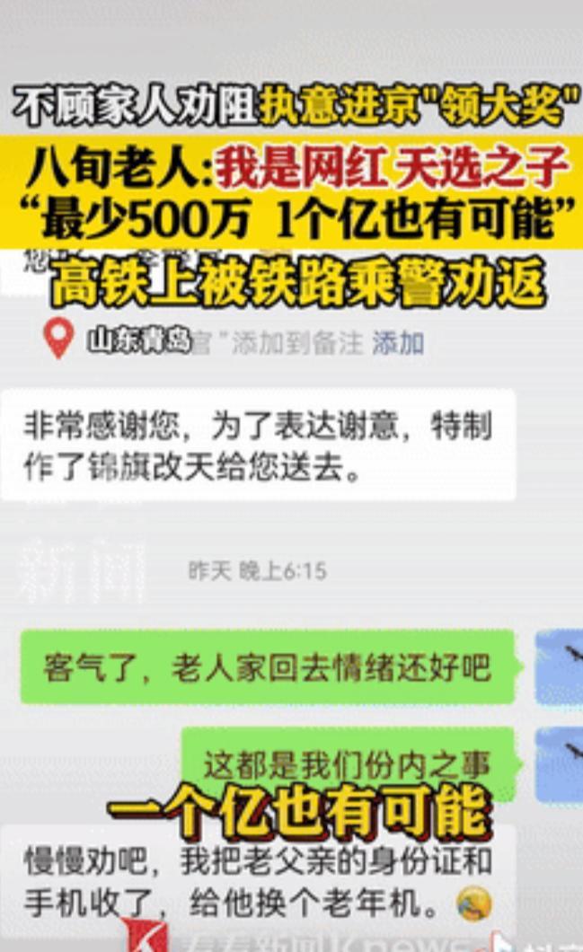 不见棺材不落泪!山东青岛,一老人刷短视频时,意外得知自己是“天选之子”,去北京总部能领大奖,最低都有5百万,甚至是上亿,老人对此深信不疑,不顾家人的劝阻,就坐上火车就出发了,急的家人赶紧报警求助! 青岛有位八十多岁的老人,最近这事在邻里间传得挺广,说起来都让人又急又气,老人平常没事就爱刷短视频,那天刷着刷着,跳出个消息,说他是 “天选之子”,北京总部有笔大奖等着领,最少五百万多了能到一个亿,就这么句话老人愣是信得死死的,跟中了魔似的。 家里人一开始以为他说着玩,没当回事,后来见他天天念叨这事儿,才发现不对劲,儿子女儿轮番劝说这肯定是骗子,哪有天上掉馅饼的事,还是这么大的数,可老人听不进去,梗着脖子说:“人家都指名道姓说我了,还知道我年轻时候得过奖能有假?” 他总觉得自己这辈子平平淡淡,老了能遇上这种 “好运”,是老天爷照顾,骗子在视频里说的那些话,什么 “您是特别的”“就该您享福”,听得老人心里头热乎乎的。 平常孩子们忙工作家里冷冷清清的,突然有人这么捧着他,还说有大钱等着,他就觉得这是真的,别人拦着都是不懂他的 “幸运”。 为了去北京领奖,老人开始偷偷攒钱,自己的买菜钱省了又省,说要凑路费和什么 “公证费”,家里人发现他藏钱急得团团转,把网上的诈骗案例翻给他看,拿手机查类似的新闻,可老人眼皮都不抬,说:“那些是别人,我这不一样,我是天选之子。” 不管家人怎么说他铁了心要去,某天早上趁家里人不注意,揣着自己买的高铁票就出了门,等儿子发现人不在票也没了,赶紧往火车站跑,可火车已经开了,一家人急得直跺脚,实在没办法,只能打了报警电话,求警察帮忙拦住他。 这边老人在火车上坐着,心里还盘算着领了奖要给孙子买什么,浑然不觉家里人都快急疯了,乘警接到报警,很快在车厢里找到了他,老人一开始还挺警惕,以为是家里人派来 “坏他好事” 的,不怎么配合。 乘警也没硬劝就坐在他旁边拉家常,问他这奖是怎么知道的,对方都跟他说了啥,聊着聊着,慢慢点出不对劲的地方:“大爷,您想啊,真有这么多钱,为啥非要您亲自去?还得先交公证费?” 又通过视频连线让他儿子在电话那头接着劝,把之前找的那些诈骗案例一条条讲清楚。 折腾了好一阵子,老人看着乘警手里的案例,听着儿子带着哭腔的劝说,那股子犟劲才慢慢下去,眼神也恍惚了嘴里念叨着 “不是真的?那他们咋啥都知道……” 到这时候,他才算真正醒过神来,明白自己是被骗了。 事后家里人把他的智能手机换成了老年机,身份证也暂时收了起来,怕他再犯迷糊,老人自己也蔫了好几天,说起来就叹气,说当时就跟被灌了迷魂汤似的,谁说都听不进去。 其实这事儿也不怪老人糊涂,他这年纪平常孩子忙,家里冷清骗子就抓住这点,天天在视频里跟他说好听的,陪着聊天时间长了,他就觉得人家靠谱,再加上说他是 “天选之子”,满足了那份被重视的心思,就一门心思信了真是不见棺材不落泪。 现在短视频上这种骗局不少,专挑老人下手,知道他们不太懂这些套路,又渴望点关注,家里人看着急可光劝没用,有时候得像这次一样,让他自己撞撞南墙才能明白,不过真等撞了墙,万一没拦住,后果可就不堪设想了。 (信息来源:环球网——“天选之子”500万元奖金!青岛八旬老人要去“领大奖”)