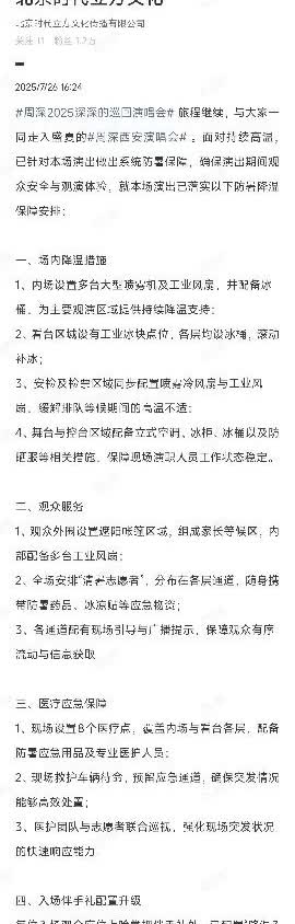 周深太贴心了!周到周全的周深! 周深7月26日西安演唱会,面对西安的高温天气有说40度的,周深彩排的时候外面围观的歌迷一直在外听周深唱歌,周深让工作人员给外面的歌迷朋友发水喝。 在26日演唱会现场为了观众,检票,安检处都有遮阳棚和风扇,看演唱会会热,给所有到场的观众每人一份伴手礼,降温三件套(扇子,冰凉贴,湿巾),分区域放风扇,还有喷雾机,还配了医疗服务。 周深给所有志愿者买了雪糕和冷饮,周深真是太贴心了!这么周到的周深谁会不感动?