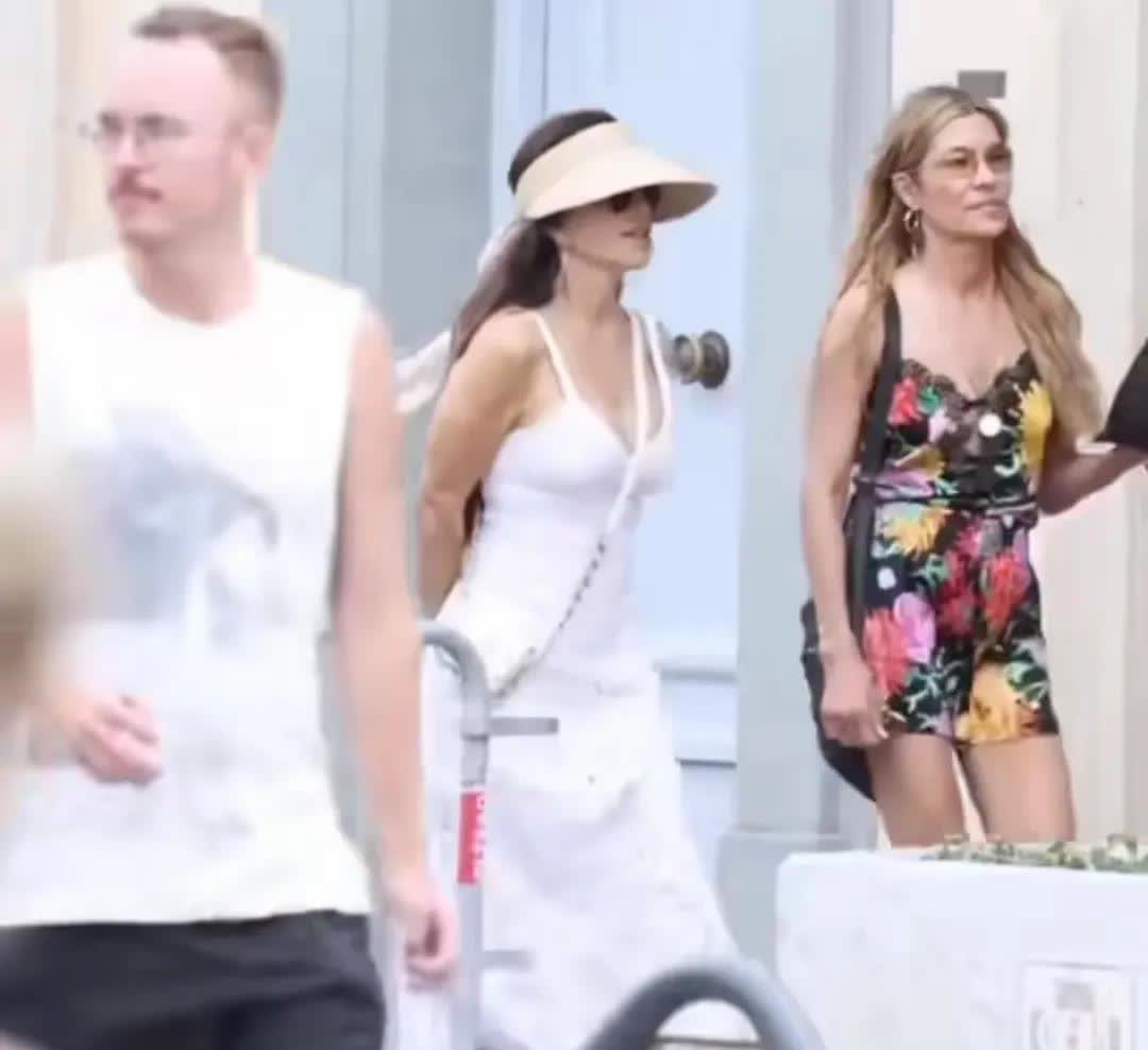 桑切斯与友人出街,一袭白色吊带镂空连衣裙搭配白色运动鞋,尽显富太的慵懒随性。草帽