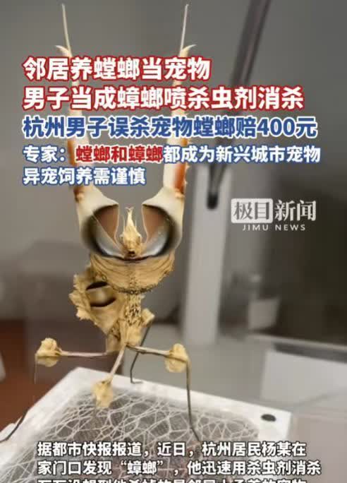 门口惊现蟑螂?浙江一男子看到家门口有虫子,就用杀虫剂喷死了,结果邻居却找上门来,说他害死了自己的宠物,要求赔钱!男子哭笑不得,只能掏钱了事。 2024年7月5号,浙江杭州城西有个小区,上演了一场让人哭笑不得的邻里大战。杨大爷在家门口瞅见俩小虫,心想:“哎呀,这不是蟑螂嘛!”二话不说,杀虫剂伺候,虫子立马歇菜了。结果,对面的小孟小伙子找上门来,说那俩虫子是他花大价钱,整整六百大洋买的宠物——魔花螳螂!非得让杨大爷赔。 杨大爷一听,整个人都懵了,心想:“我这都成灭虫英雄了?还摊上事儿了?”六十多岁的人了,这辈子跟蟑螂斗智斗勇,哪知道这年头还有人养这么奇葩的宠物? 小孟呢,刚毕业的小年轻,异宠界的忠实粉丝。他那魔花螳螂,还是从非洲漂洋过海来的贵族呢,老贵了。那天他给螳螂换房子,一不留神,俩小家伙越狱了。等他反应过来,楼道里头已经是杀虫剂的味道弥漫,他的宝贝螳螂已经躺在杨大爷家门口,成了“烈士”。 这事儿一出,小区里头炸了锅,大伙儿议论纷纷,都说这年头年轻人养的宠物越来越让人看不懂,新矛盾也跟着来了。他砰砰砰砸开了隔壁老杨的门,一脸着急上火,非要人家赔钱。老杨呢,一脸懵圈:“虫子嘛,不就是拿来拍的吗?”俩人你一言我一语,差点没吵翻天,最后还得警察叔叔来劝架,老杨不情不愿地掏了400大洋。 这事儿在小区里炸了锅,大家伙儿议论得热火朝天。有人站队大爷,说公共地盘哪能容忍那些奇奇怪怪的虫子乱窜;也有人挺年轻人,说现在养个异宠多时尚啊,感情深着呢,跟养猫养狗没两样。虽说那魔花螳螂是个小昆虫,可在主人眼里,那可是活生生的宠物宝贝。 网上网友们也是各种神评论:“看到个虫子还得满楼道打听是谁家的?”也有人琢磨上了:宠物还是害虫,这界限到底谁说了算啊?