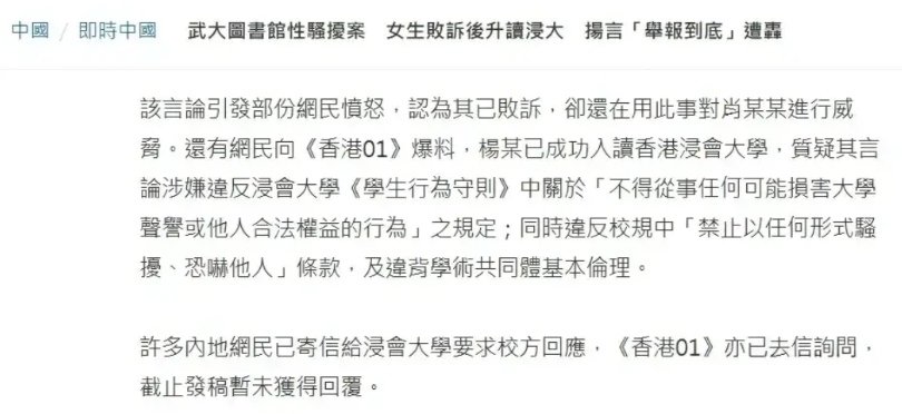 杨景媛要笑不出来了,她小瞧了网友的战斗力,网友们你发一封邮件我发一封邮件,势必要让她读不了博。 她毁了肖某原本光明的前途,让他失去了保研资格,被迫休学在家,家人因此离世。 自己却顺利保了研,现在又要美滋滋的去香港浸会大学读博了。法院判决肖某无罪后,她依旧得意洋洋,说会继续举报,让肖某上不了学,毫无愧疚之意。 看她得意的样子,网友们可不惯着她,一封封的信发到学校,港媒已开始跟踪报导武汉大学图书馆诬告事件了。 最可恨的是这个女的竟然是学法律的,一旦她毕业回国进入公检法,谁信她会公正。 希望香港浸会大学能依据校规和当地法律,给她应得的处罚,不要把这种道德败坏的人一直耀武扬威。