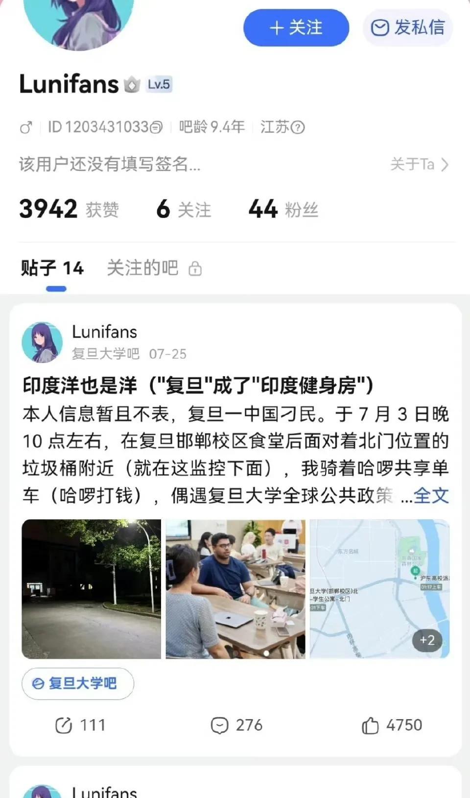 复旦学生被印度暑期留学生殴打这件事,百度复旦大学贴吧的吧主很刚啊,一直把帖子置顶着。另外看了发帖学生的主页,这孩子也可怜,是一个纯纯数学爱好者,已经两年没发帖子了,这次被无故殴打还得不到处理,才愤然发帖。希望复旦大学和当地警方能给他一个公道吧。