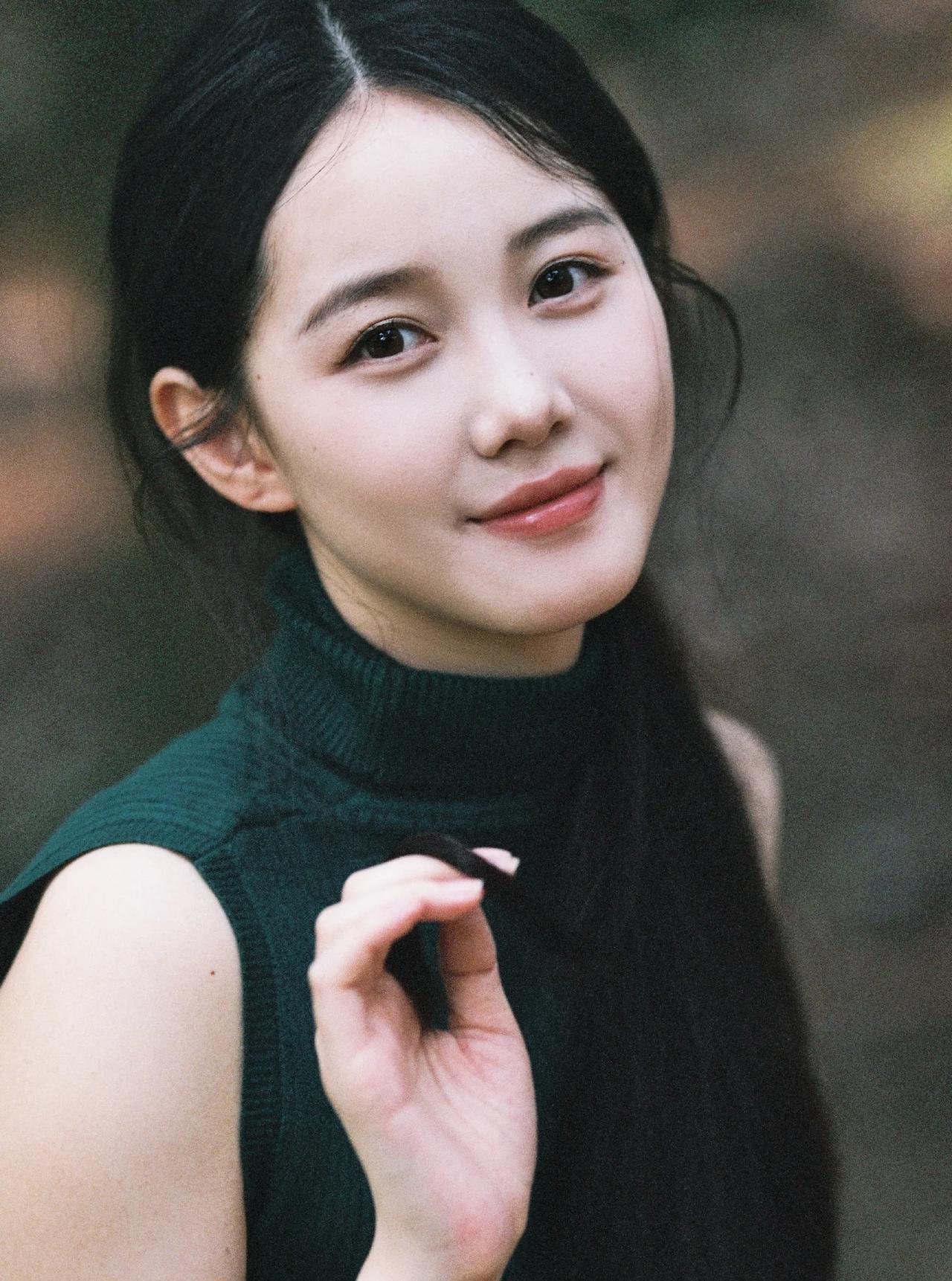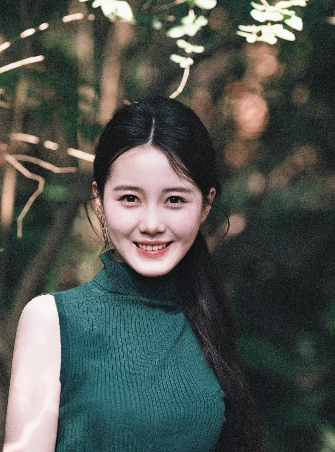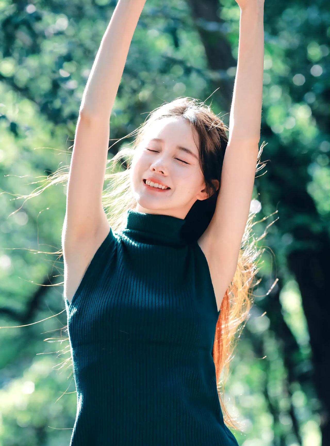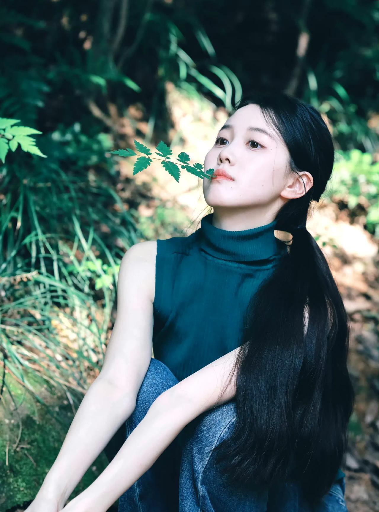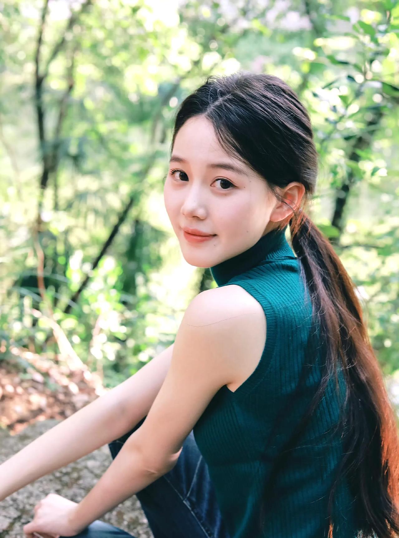 漫步林间,阳光透过叶隙洒落。她身着墨绿色无袖针织衫,搭配休闲牛仔裤,随性又自在。发丝随微风轻扬,笑意明媚,将少女的灵动与自然的清新,揉成一帧温柔画面。