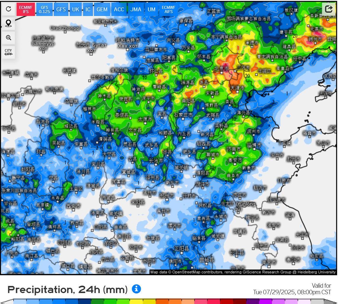 今晚华北地区的强对流正在快速发展增强,西北、西南各有两片强对流云团向北京地区移动,即将给北京大部带来明显的大风的降雨天气。目前中央气象台预报的雨量非常大,京津冀中部、辽宁中南部将有大到暴雨,北京南部和东北部有大暴雨,最大日雨量可达200毫米上下。但数值预报给出的雨水明显偏弱,京津冀中部也就30-50毫米的雨量,差异较大。 并且由于冷空气有所调强,这场强对流的范围也往南延伸了一些,山东中北部、河北东南部也有望出现中雨局部大雨。但河北西南部由于地形原因,这次还是难以出现明显对流活动,即使有对流也比较分散,下雨的地方算是运气好。