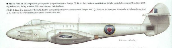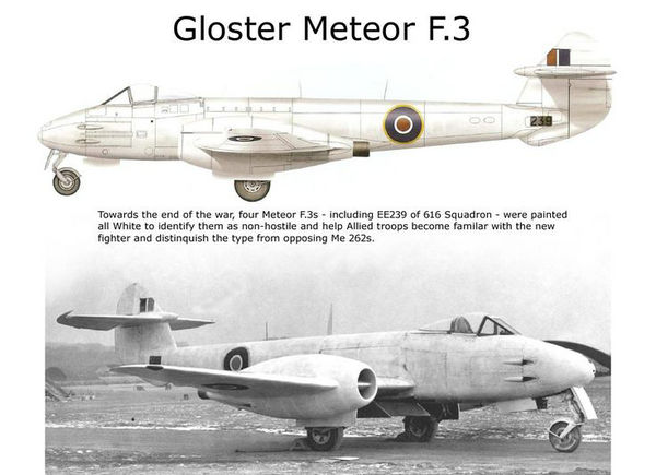 一架格洛斯特“流星” F Mark III喷气战斗机被推至比利时梅尔斯布鲁克机场B58号疏散点,该机编号EE239,无线电呼号YQ-Q,隶属于英国空军第616中队分遣队。 当时为对抗德国空军梅塞施密特Me 262喷气战斗机的威胁,第616中队曾派出一个小队配合第二战术空军执行防空任务,1943年3月整个中队编入该部。在部署初期,这些流星式战斗机被漆成白色,以便其他盟军飞机识别。不过遗憾的是,两种喷气式战斗机根本没有碰到过,更别说一较高下了。