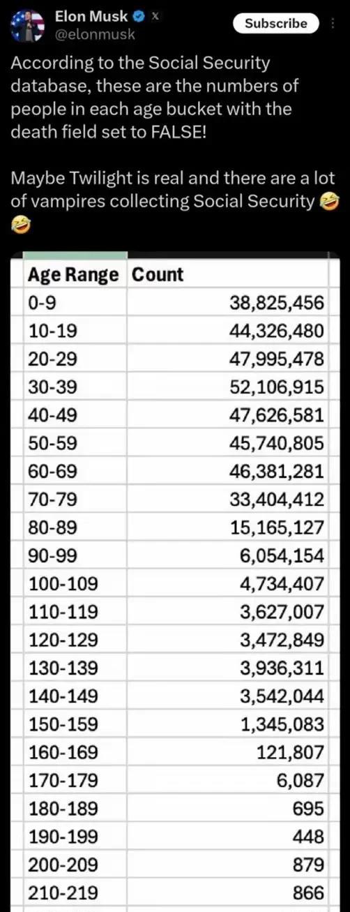 三哥家惊现活了298岁,精神矍铄、老当益壮的老人。 有网友表示质疑。同样立马就有网友回应说:“发生在三哥家的事情,再新奇都是有可能的。” 又有网友说:“这算什么,美国有领退休金的,都已经是369岁了。” 怪不得国内有人对美国崇拜得五体投地,大有跪啃脚趾的意愿呢?原来那里的人能活这么久呀!