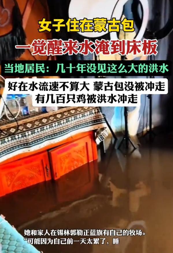 好吓人!内蒙古锡林郭勒,女子早上起床突然发现自己住的蒙古包被水淹了,差点就要没过床边,网友:谁说内蒙古没有海! 女子介绍,当时正处在半梦半醒之间,耳边除了狗叫,还夹杂着一阵阵奇怪的水声,本来还以为是窗外下雨,直到看见屋里的柜子都泡在水里,才意识到是洪水进了家门 而不仅是她,蒙古包外大片草原已经变成泽国,旁边其他蒙古包也没能幸免,全泡了 她紧急转移到了稍高的位置,人是安全了,但牧场损失不小,光鸡就冲走了好几百只。当地老人都说,这样的水势几十年未见,虽说草原下雨不稀奇,但能积成这样的大水确实罕见 有网友调侃:终于等到这一天了:我大内蒙也能争一争这航母命名了,下一艘航母就叫内蒙舰。以前看沿海省挣航母内蒙子弟只能默默走开! 还有网友说:我终于相信有蒙古海军司令这个称呼了 当然,这都是玩笑话,这样的“大海”还是少来一些比较好 说起来,蒙古包虽然是传统民居,四处透风、底部贴地,防雨靠的是经验,但对突发的洪涝基本没有防守能力 这场突如其来的水,既不是因为河水泛滥,也不是湖泊决堤,而是因为连日的强降雨把草原的低洼地带瞬间灌满,水无处排,只能往人群聚居的低地漫,希望这些大水能够早日散去 #女子住蒙古包睡醒发现水淹到床板#