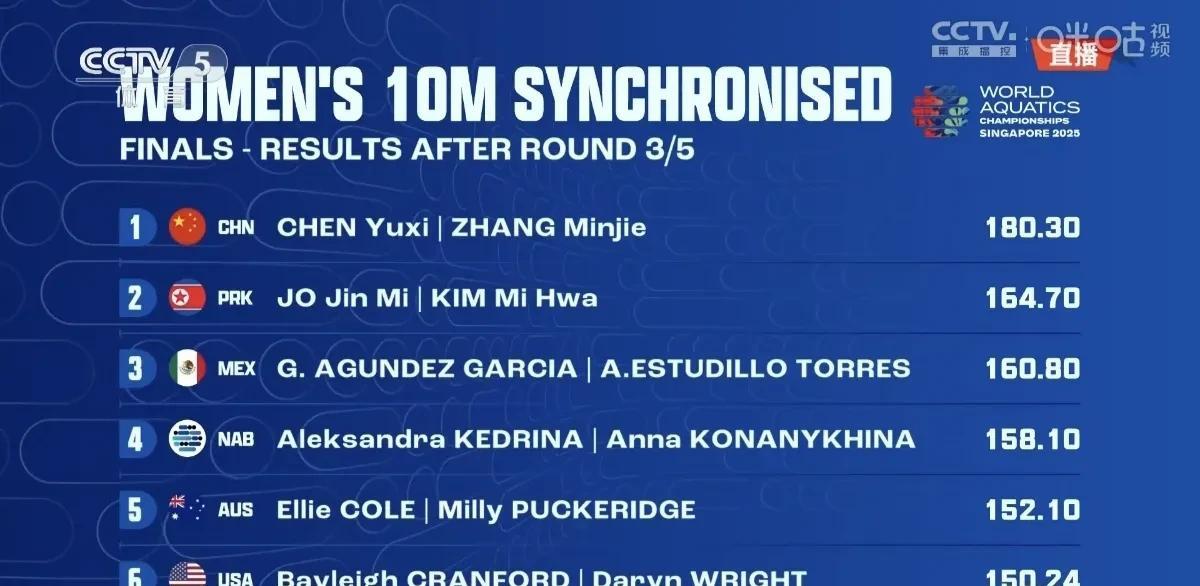 恭喜!陈芋汐/掌敏洁荣膺女子双人十米台冠军! 今晚,世界泳联世锦赛(跳水)女子双人10米跳台决赛,排名预赛第一的中国的陈芋汐/掌敏洁将向冠军发起冲击。 比赛开始,陈芋汐/掌敏洁从第一跳就开始领先,全程未遇挑战。 349.26分,冠军! 陈芋汐与新搭档掌敏洁发挥完美,五轮结束,断层领先夺得冠军!中国队豪取这个项目15连冠! 恭喜陈芋汐/掌敏洁!