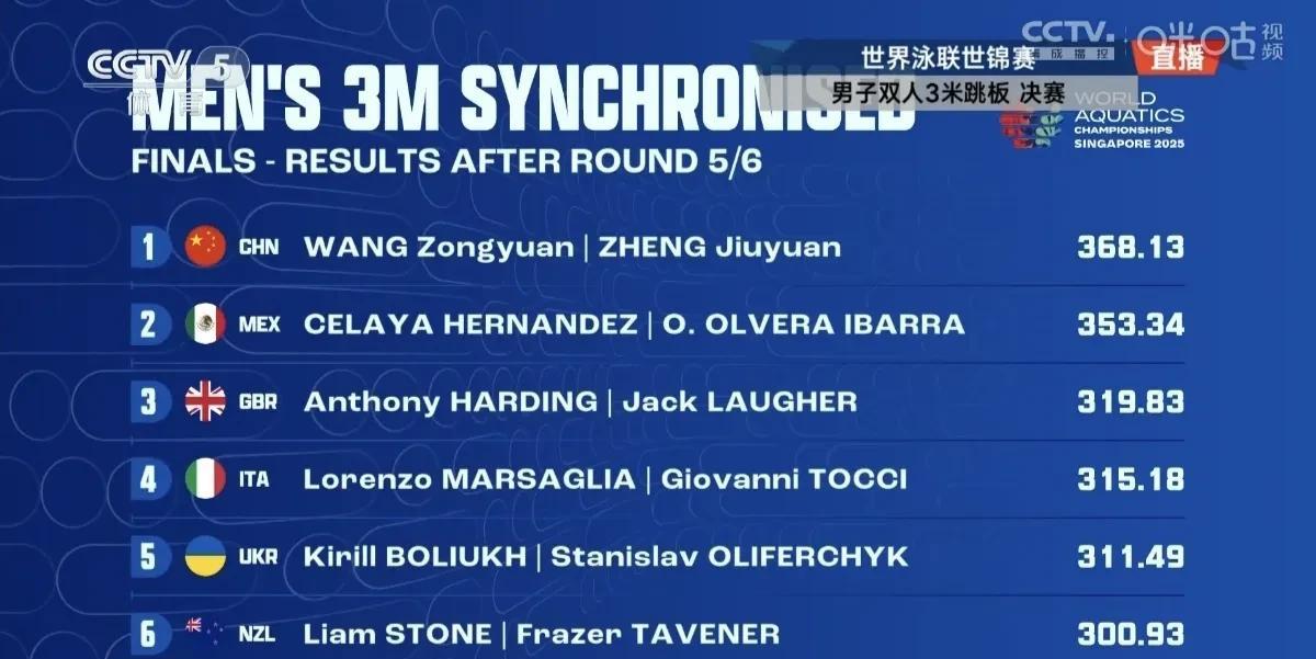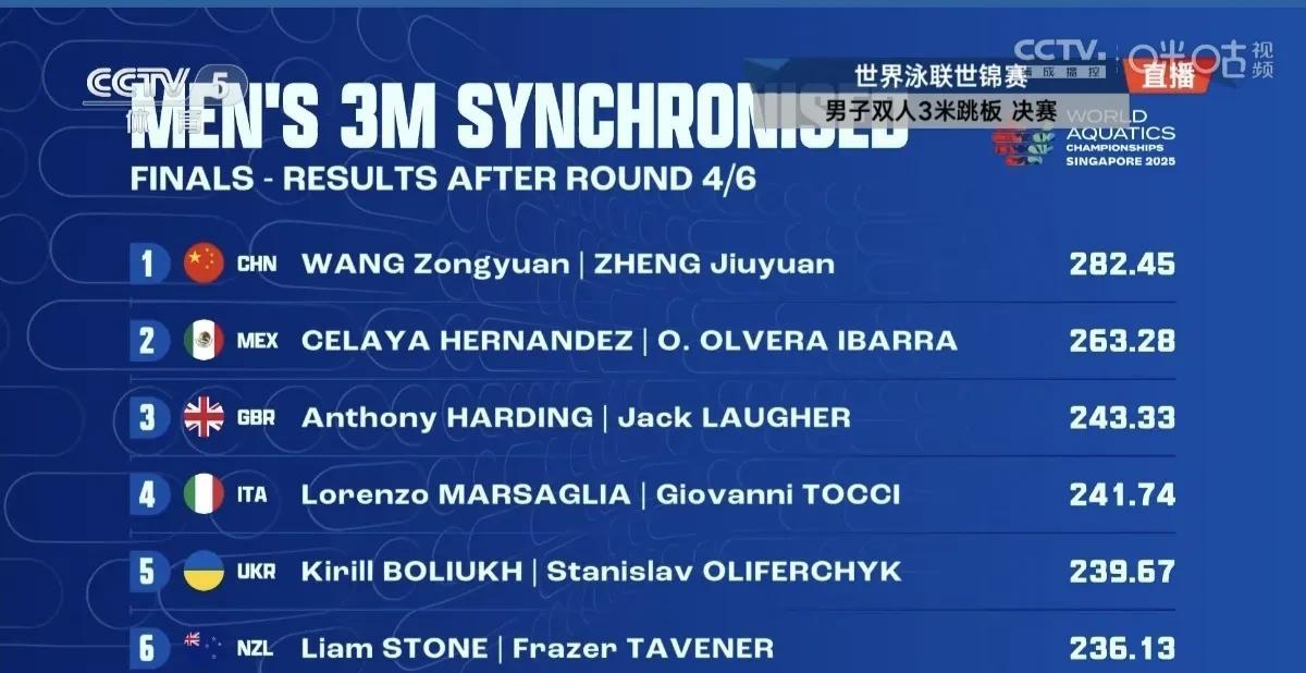 恭喜!王宗源/郑九源夺得男子双人三米板金牌! 今天,2025世界泳联