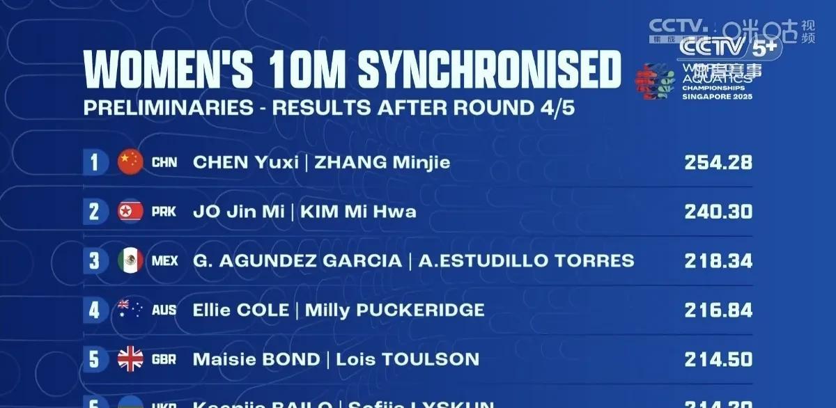 陈芋汐/掌敏洁轻松获得预赛第一,晋级女子双人十米跳台决赛! 今天,2025世界泳联世锦赛(跳水)女子双人十米跳台预赛,中国的陈芋汐/掌敏洁出战。 331.08分,经过5轮角逐,陈芋汐/掌敏洁发挥稳定,以领先第二名朝鲜选手22.62分的绝对优势获得预赛第一,晋级今天晚上将要进行的女子双人十米跳台决赛。 恭喜陈芋汐/掌敏洁!