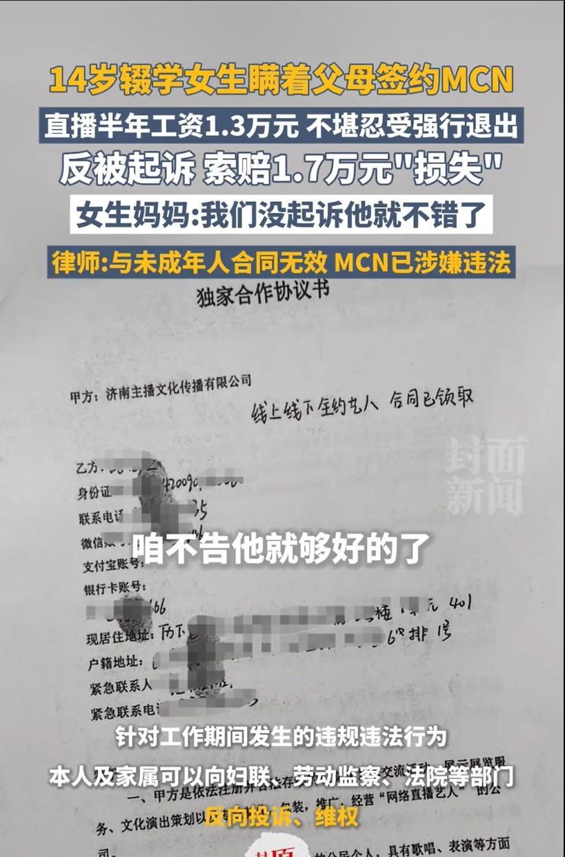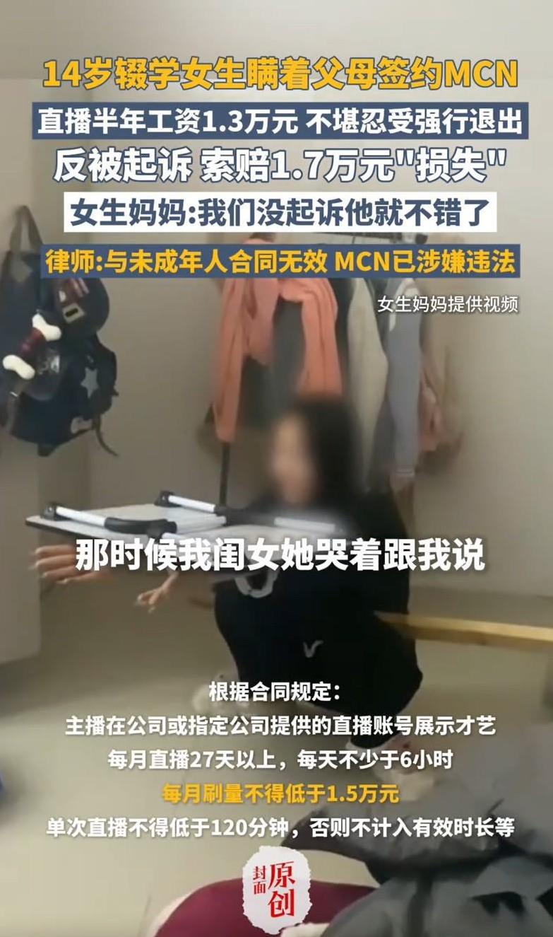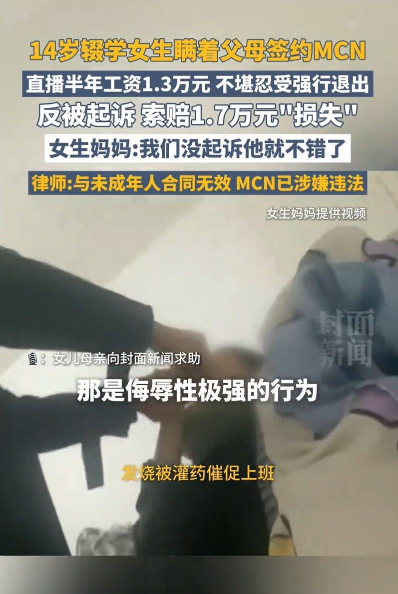 山东德州,一14岁女孩初中没毕业就辍学了,跟着大一岁姐姐出去闯,因涉世未深,被MCN忽悠做了主播,被一份5年合同套牢,各种不合理条款,还遭到“变 态”管理,每天直播6小时起步,完不成任务当众罚蹲唱、被男老板倒立抱起。女孩发烧时,遭捏鼻灌药逼上岗,男主管随意进出女生宿舍。结果,女孩做了6个月才发了1.3万元工资。女孩无法忍受,选择解约。没想到,公司却向女孩索赔近2万,咬定"女孩违规害账号被封"造成损失。 2025年7月28日,据封面新闻报道,发生一起MCN违法招收未成年孩子做主播并违规管理的案件,这到底是怎么回事呢? 2023年9月,初二辍学女孩小云独赴济南“闯世界”,与某传媒公司签订《主播独家合作协议》,彼时,小云才14岁。 家属看到这份合同条款时,指控这份合同堪称“卖身契”,里面暗藏各种不公平、不合理的致命条款。 合同约定5年合约期,小云每月直播要超过27天,日均直播时间要不少于6小时,月刷量指标1.5万元,未完成则扣薪。 小云直播的全部收益由公司代管,但所有税费及工作成本则由小云自己承担,公司概不承担。 小云如擅自接活动赔50万、劝诱同事离职赔50万、透露合同内容赔50万,赔款金额之巨,难以想象。 合同到期后,公司有优先续约权,而且包括自动续约条款。 在履约过程中,小云一旦未达直播指标时,被罚当众蹲地唱歌,聚餐时,还会遭男老板倒立抱起。 小云发烧期间,男老板闯入女生合租屋“捏鼻灌药”逼其直播。 小云合计工作6个月,总收入1.3万元,远低于合同保底6000元/月承诺。 有人说,既然母亲李丽已经签署了监护人同意书,那么合同应当认定为有效了。 《民法典》第19条规定,八周岁以上的未成年人为限制民事行为能力人,实施民事法律行为由其法定代理人代理或者经其法定代理人同意、追认。 本案中,小云与公司签署主播合约时,年龄才14周岁,属于限制民事行为能力人,对外签署协议,需要经过监护人即母亲李丽的同意,否则不具有法律效力。 小云所签署的合约,包括5年长约、日均6小时高强度直播、50万元天价违约金等条款,明显超出14岁辍学小云的认知能力和风险判断力。 合同要求承担交通、住宿等费用,且收益由公司代管,实质形成人身依附性,非普通“合作”关系,该等内容对小云极为不利。 公司事后要求母亲补签《监护人同意书》的行为,属于事后追认,从形式上貌似可以让合同有效,但是,追认仅针对合同效力本身,不改变签约时合同本身违法性导致无效的情形。 若签约时存在欺诈、胁迫,如隐瞒合同关键条款,或条款本身显失公平,追认亦可能无效。 关键是,《民法典》第35条规定,监护人应当按照最有利于被监护人的原则履行监护职责。 即便不考虑小云签署的合约本身没有效力效力瑕疵,但因监护人李丽签署监护人同意书对小云不利,该追认也不应发生任何效力。 因此,母亲李丽签署了监护人同意书,小云签署的合约依然不发生效力。 有人说,公司的“变 态”管理严重侵害了小云的身心健康,小云有权拒绝继续履约。 《劳动合同法》第56条规定,劳动者对用人单位管理人员违章指挥、强令冒险作业,有权拒绝执行;对危害生命安全和身体健康的行为,有权提出批评、检举和控告。 在履约过程中,公司对小云存在捏鼻灌药、强行进入住所、当众体罚倒立、蹲唱等,均属于严重侵害他人人身权利的行为,也未尽到基本安全保障义务。 小云在这种情况下,有权拒绝继续履行合约。换言之,小云因人身安全受威胁而离开,属合法解除权行使,无需承担违约责任。 《民法典》第186条规定,因当事人一方的违约行为,损害对方人身权益、财产权益的,受损害方有权选择请求其承担违约责任或者侵权责任。 也就是说,小云母亲不仅不需要承担公司所主张的索赔责任,还可以向公司主张违约责任或侵权责任,包括但不限于医疗费、精神损害赔偿等。 对此,大家怎么看?#头号创作者激励计划#