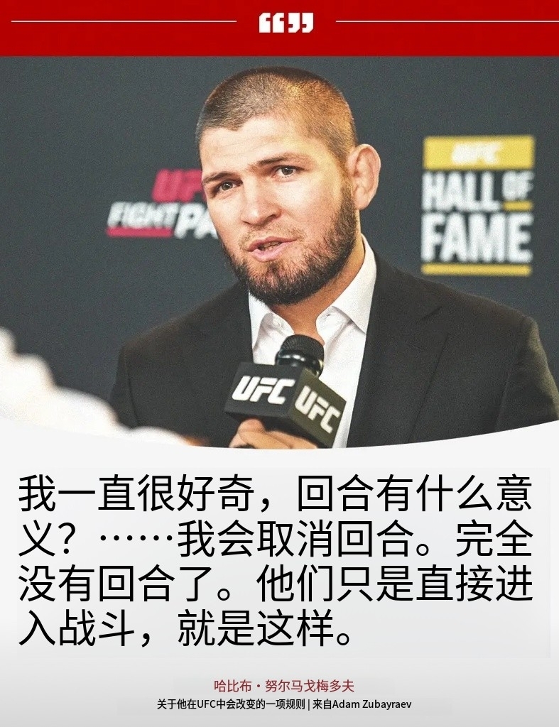 小鹰哈比布对MMA比赛的回合制感到不满 小鹰哈比布近日表示:“我一直很奇怪,回合的意义何在?这一切的意义何在?它是为了娱乐,比赛会暂停播放广告之类的,我明白。它是为了生意。但如果我们谈论的是体育,我会取消回合制。完全没有回合。”“你走进八角笼,常规赛 15 分钟,冠军赛 25 分钟。中间没有回合,完全没有回合!” 你同意小鹰的观点吗?你觉得UFC应该取消回合吗?