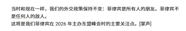 在惨败之后,他的语气开始软化了。 菲律宾总统小马科斯在7月28日发布的最新国情咨文中,通篇未提“南海”一词,反而表示:“菲律宾是所有人的朋友,不是任何人的敌人。”这番表态的背后,有着深刻的政治考量。 一方面,菲律宾将在2026年担任东盟轮值主席国,届时必然要与中国展开更多接触与合作,小马科斯不得不调整立场,为东盟事务预留外交空间。 另一方面,更为敏感的原因是,针对副总统萨拉·杜特尔特的弹劾刚刚被菲律宾最高法院裁定为违宪,萨拉有望参加2028年总统大选。一旦她成功当选,马科斯家族可能面临彻底清算,政治风险陡增。 有人甚至讽刺说:“总统先生,您也不想看到美国银行里那数十亿美元被冻结查封吧?”