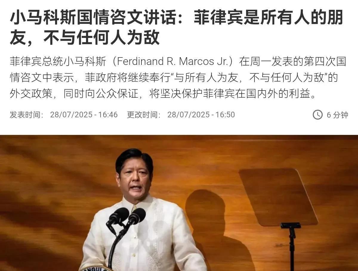 菲总统马科斯,从美国回来后,说话都不一样了,不知美国给他,灌了什么迷魂汤? 现在的马科斯,对未来有点找不到方向了,往哪走和不该往哪,出口在哪都分不清了。我看菲律宾政府,要给他配个随身导航器,带在身上才不会迷路,丢失了方向。 据法新社7月29日报道,马科斯总统,在国情咨文发布会上表示,说菲律宾是所有的人朋友,也不会以任何一个国家为敌。看来马科斯是有点心虚,才会说出这样的话。 大家都知道,国与国人与人之间,只有你把对方当作朋友,对方才会视你为朋友,如果你,把对方当作是敌人,那么对方自然的,也会把你当成敌人来对待。 马科斯还自吹,国际社会一直都给予菲律宾高度的评价,你信吗?反正吹牛又不用花钱的,不论发生什么事,菲律宾不会冲动,而是用成熟和冷静的方式来处理,包括与各国打交道,也就是说,菲律宾做什么事都很分明和成熟稳重的,说明白点,也就是说,一般的国家却做不到的,我菲律宾可以做到,有一点好像教人做人做事的道理。 个人认为,菲律宾总统马科斯,现在说什么都没有用,尽快解决国内水灾,才是最重要的。