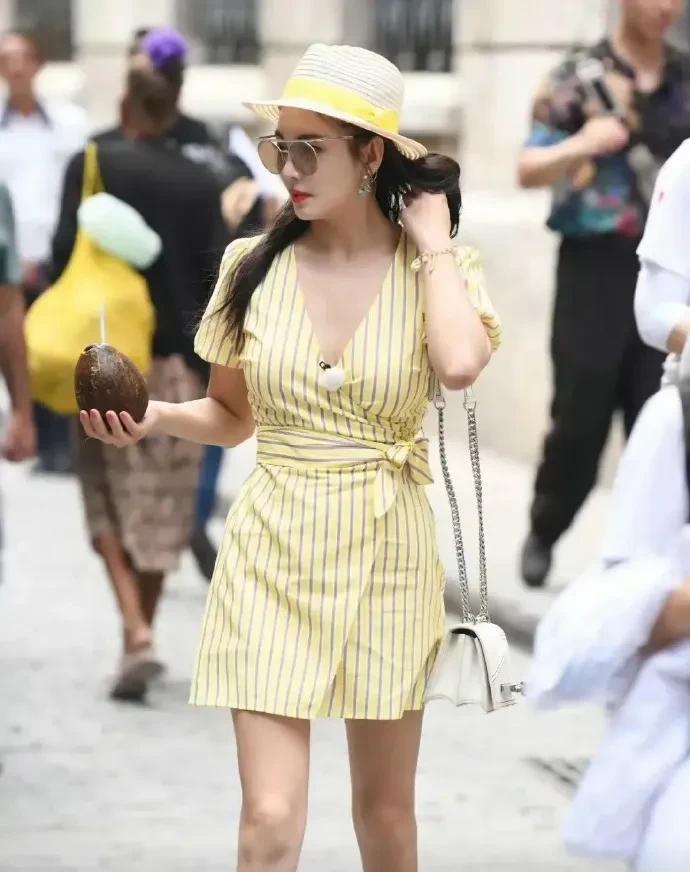 张雨绮穿黄条纹裙杀疯啦!深V 设计藏不住凹凸感,脸蛋嫩得能反光,走路带风,这身材直接把路人看呆!